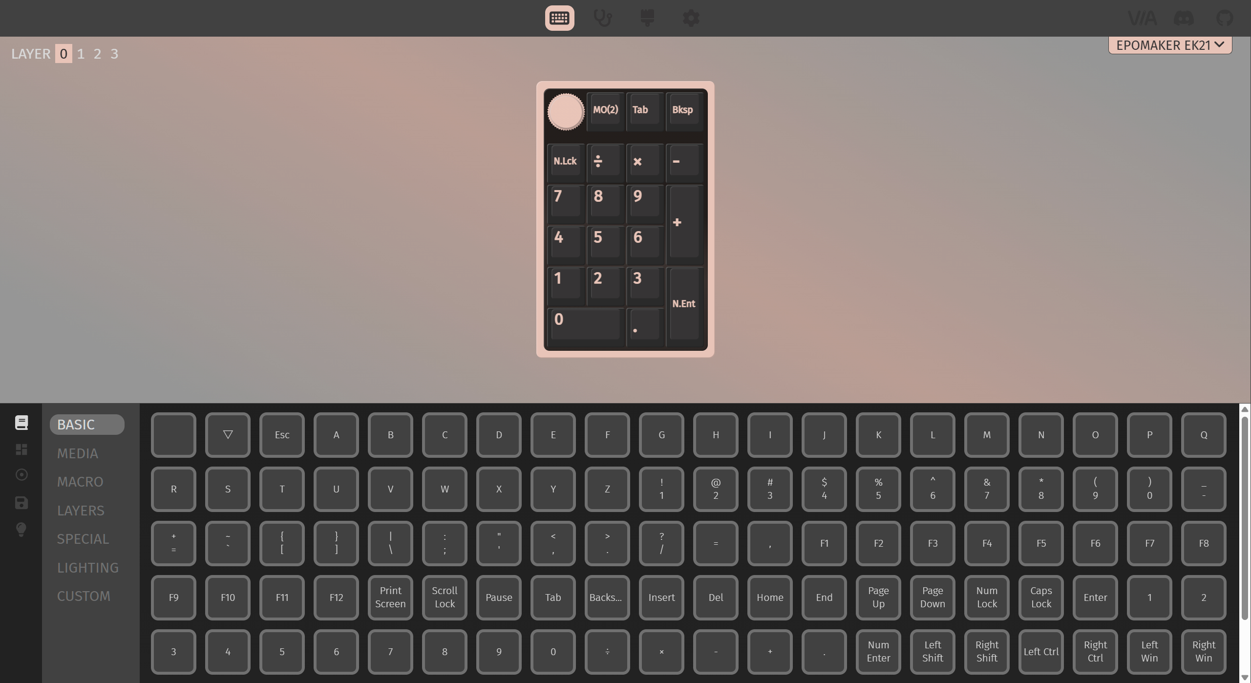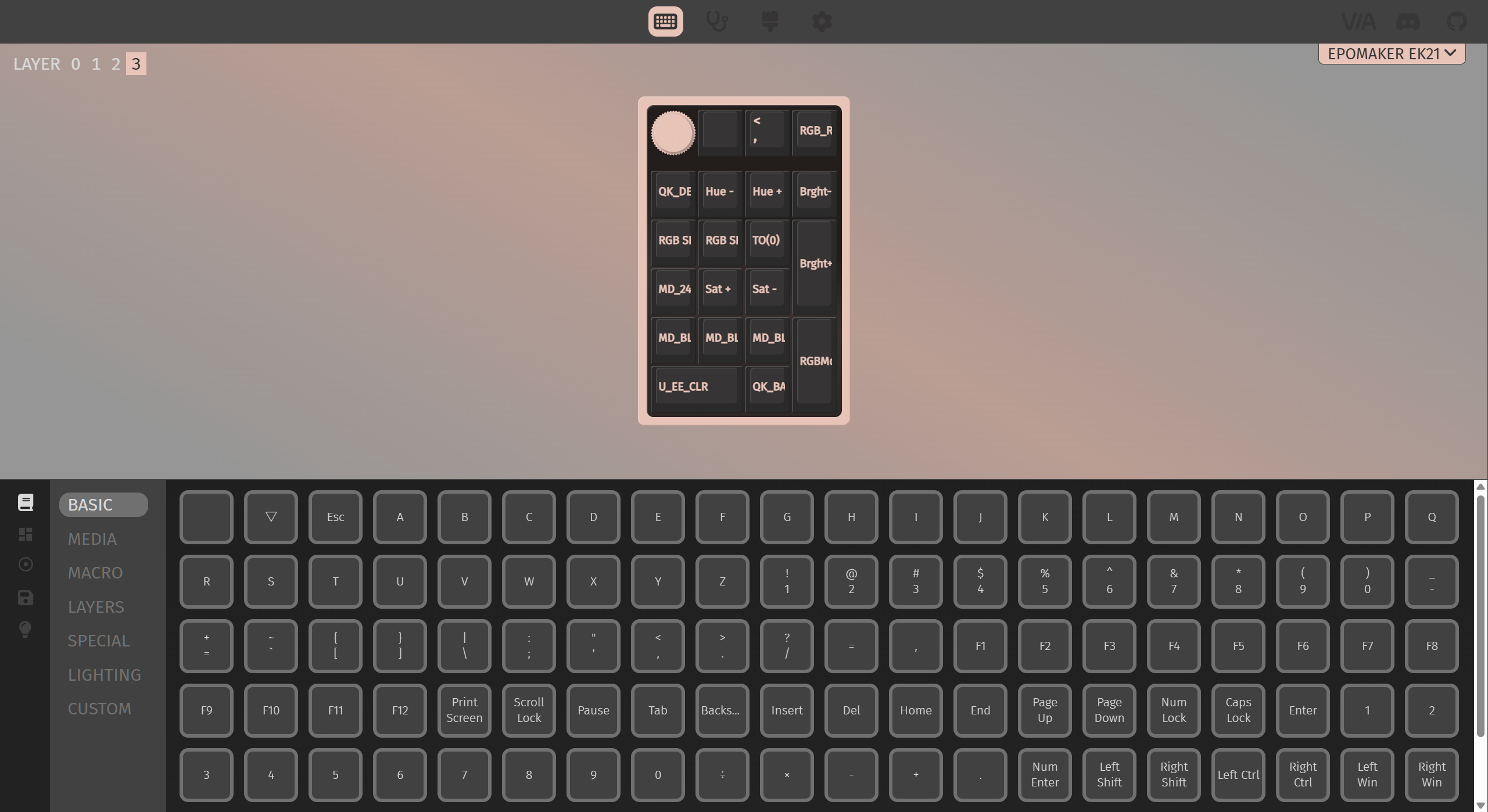 Epomaker EK21はVIAに完全対応しているため、全20キー+ノブの機能を自在にキーリマップ(配列変更)できます。