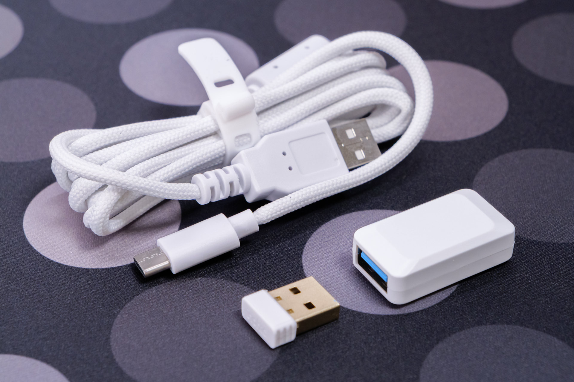 2.4GHzレシーバーは本体裏面に収納されており、USBポートに直接差し込むだけで接続可能。変換アダプターを使えば、レシーバーを延長して使用することもできます。