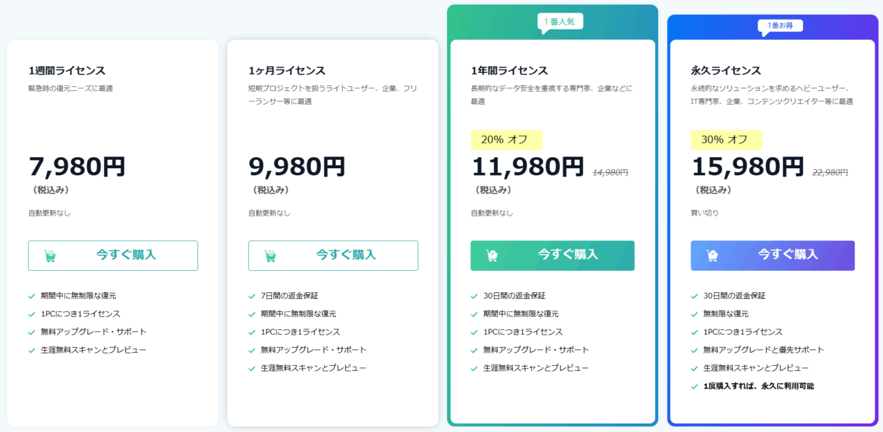 継続的に使うならコスパの良い「1年間ライセンス」や「永久ライセンス」がおすすめです。
