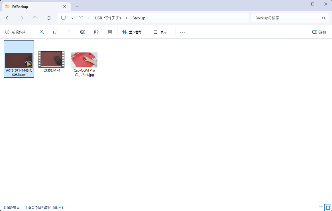 今回は、32GBのUSBメモリを用意し、動画ファイル(MP4、BRAW)と写真データ(JPEG) の3種類を使ってテストしました。