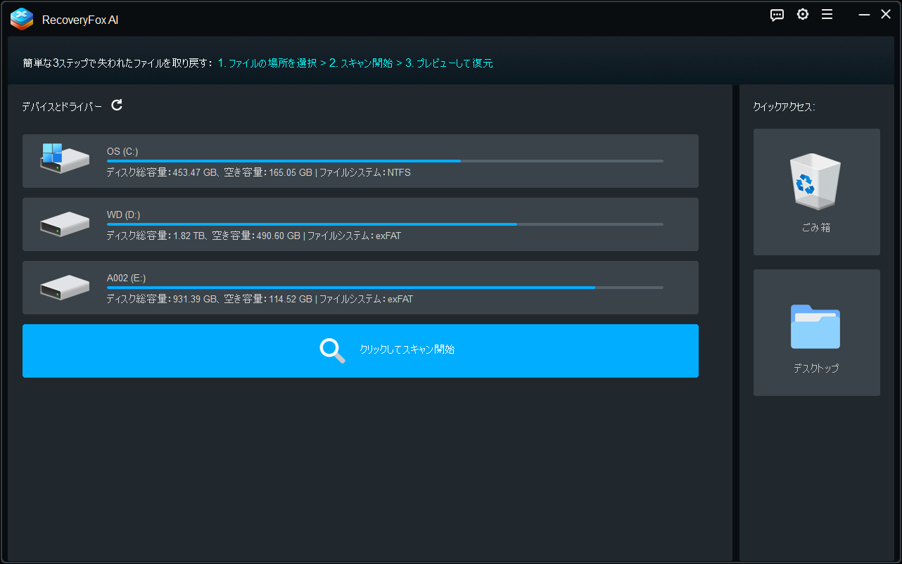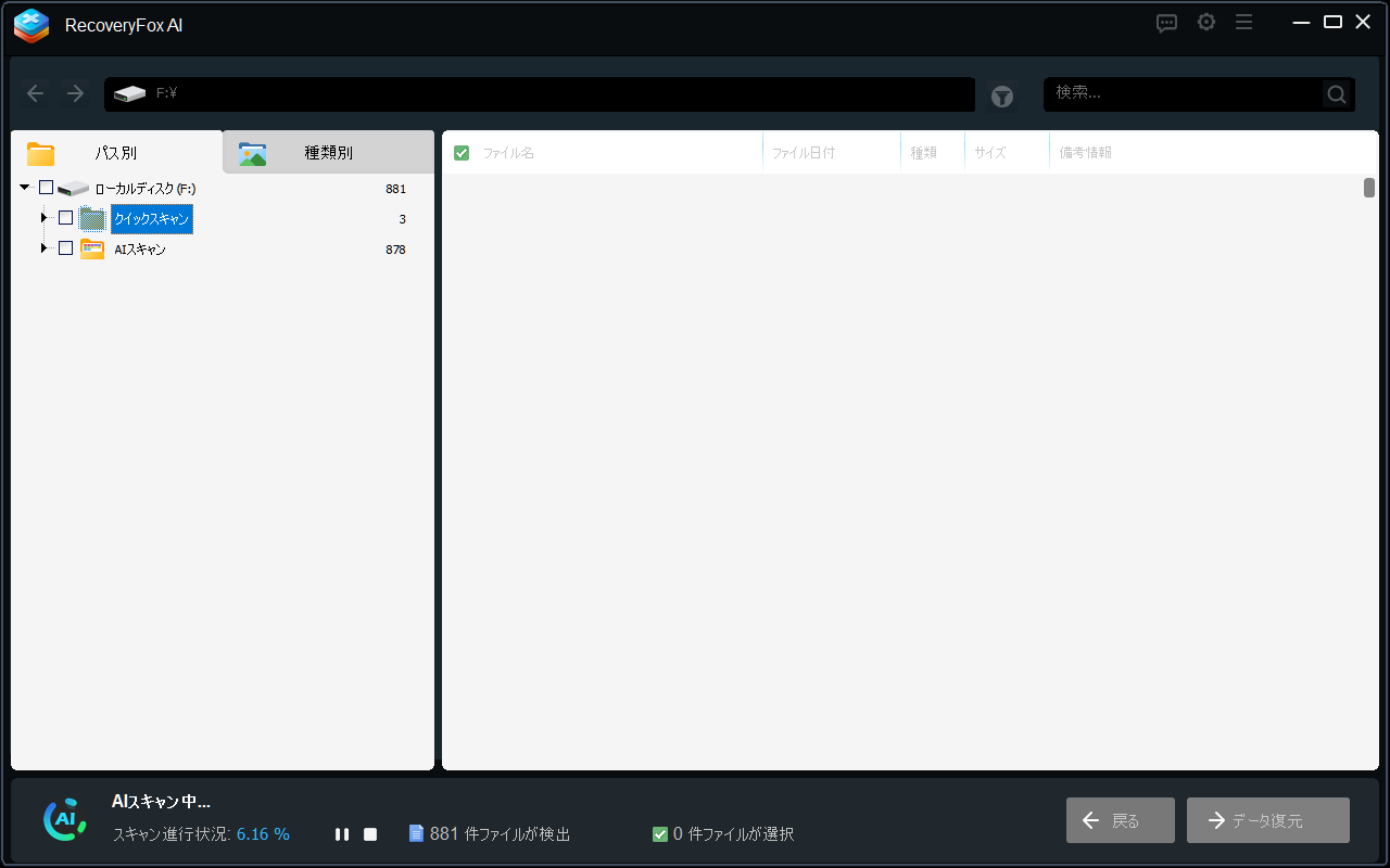 RecoveryFox AIを起動し、対象ドライブを指定するとクイックスキャンが開始されます。