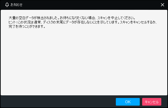約1分後に「大量の空白データが検出されました」というポップアップが表示され、AIスキャンが終了しました。
