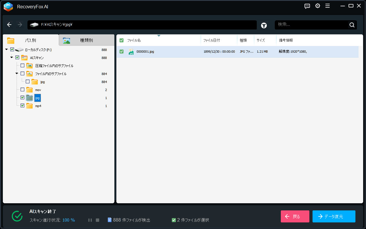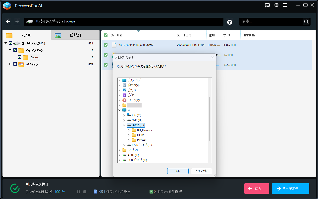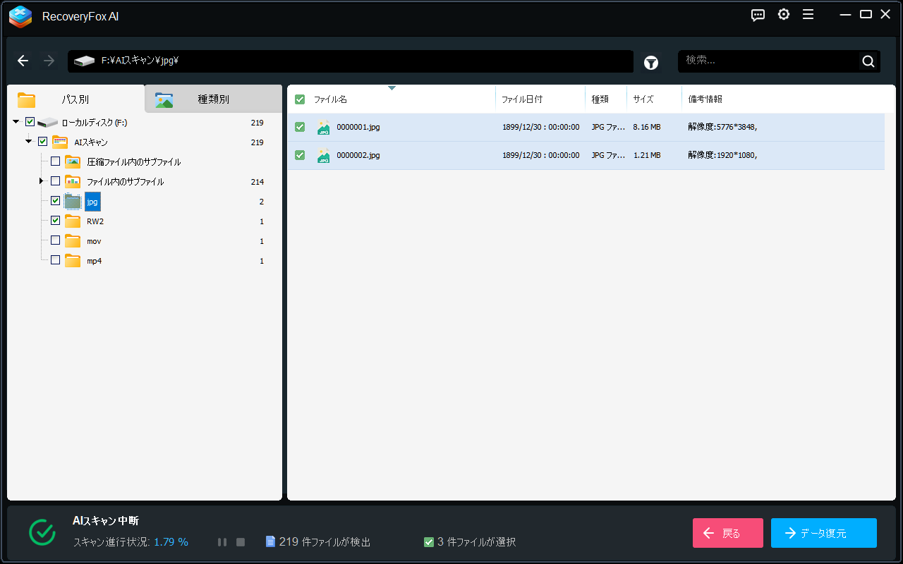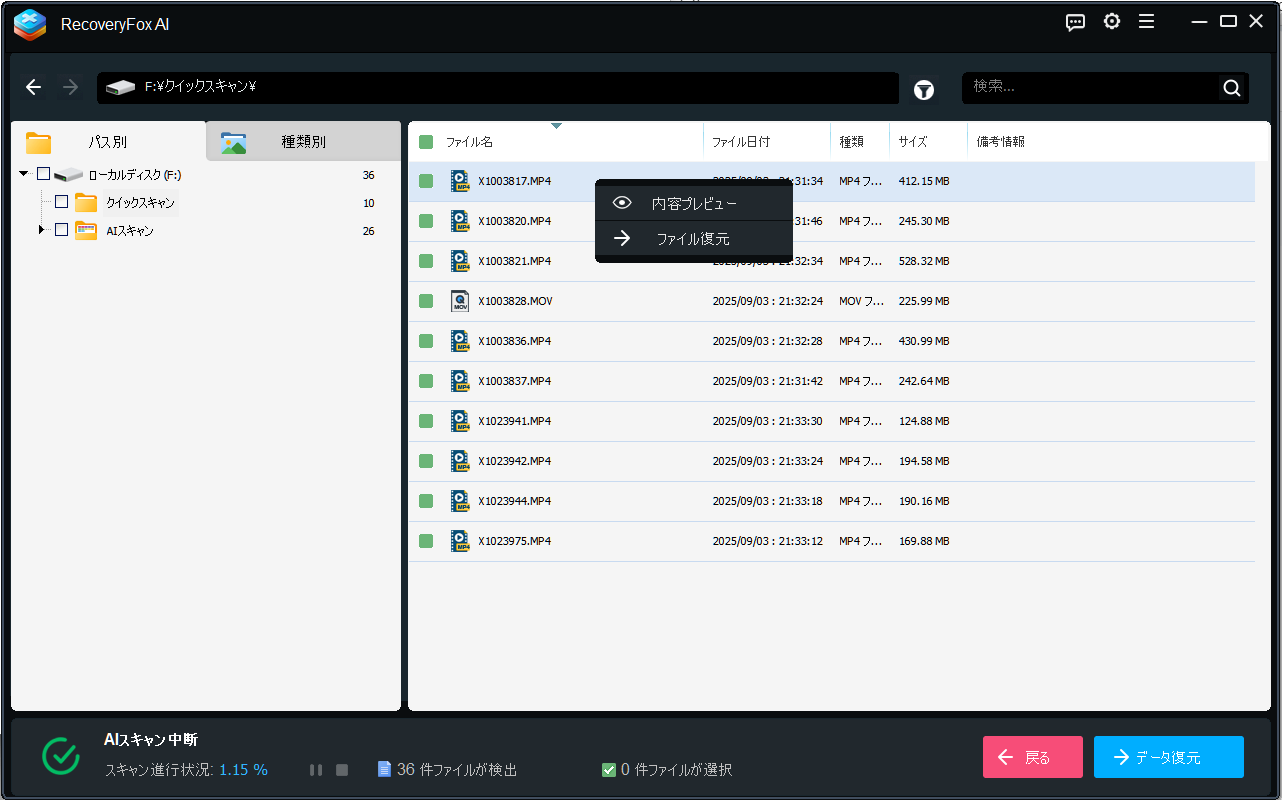 クイックスキャンは短時間で削除直後のファイルを復元でき、AIスキャンはフォーマット済みや断片化したデータも検出可能と、それぞれの役割がはっきりしているので、とても使いやすいと感じました。