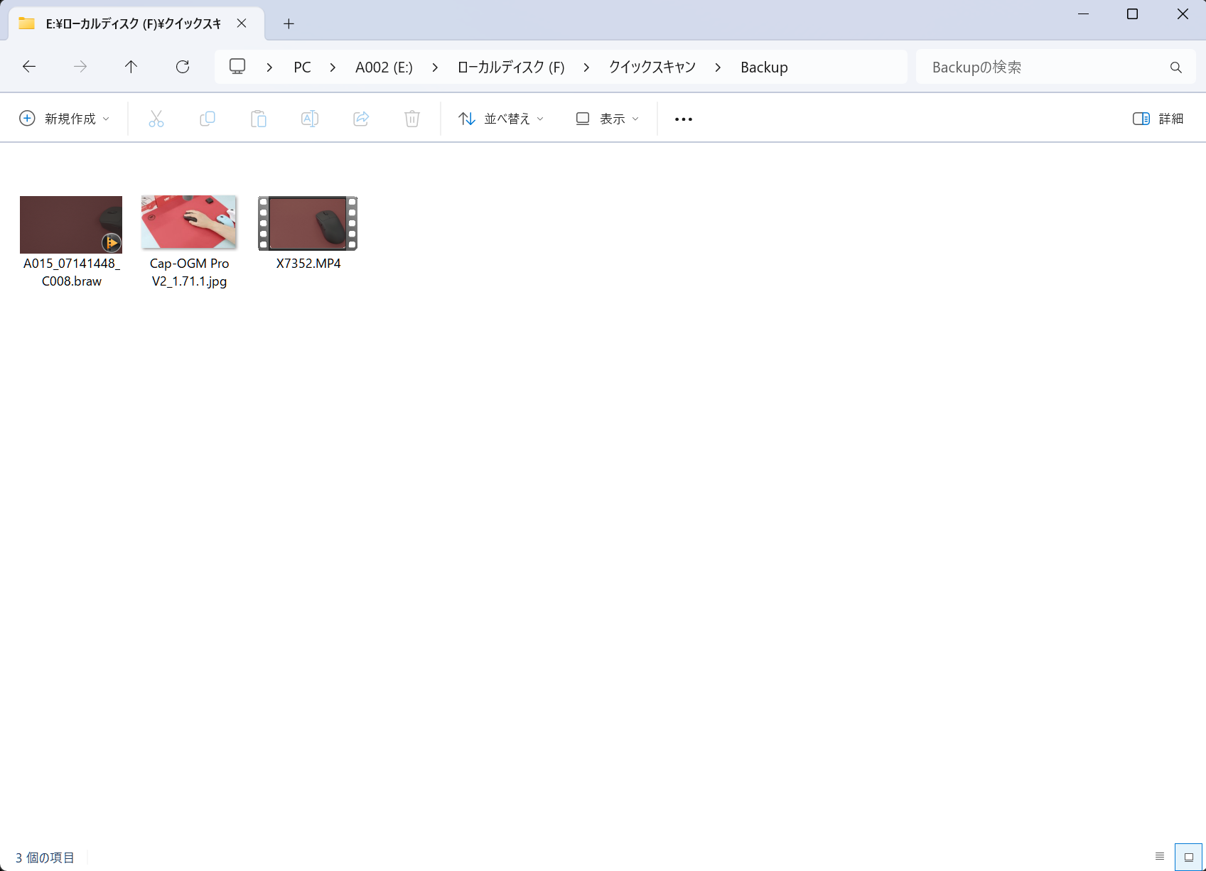 こちらが結果画面です。「ローカルディスク (F:) > クイックスキャン > Backup」 に削除した3つのファイルが表示されていました。