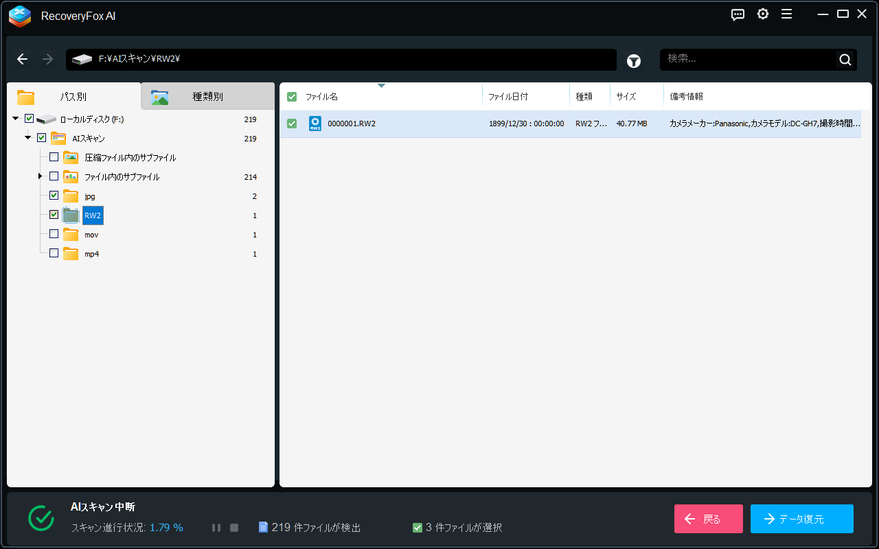 後からテストしてみた結果、クイックスキャンとAI スキャン両方のパターンでRAWファイルも問題なく復元できました。