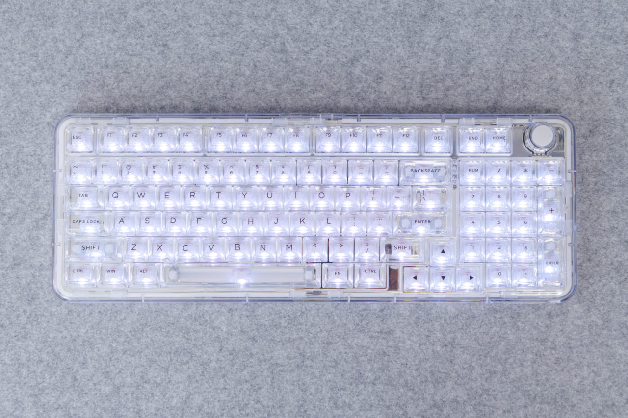 電源を入れるとバックライトが点灯し、全面クリアケースとクリスタルキーキャップの組み合わせにより、まるで宝石のように輝きます。RGBは明るさやカラーを細かく調整でき、好みに応じて落ち着いた雰囲気にもカスタマイズ可能です。部屋の明るさによっても印象が変わり、照明を落とせば一層幻想的な雰囲気になります。