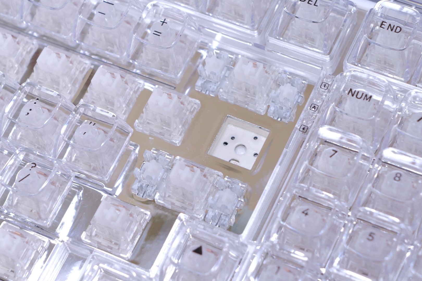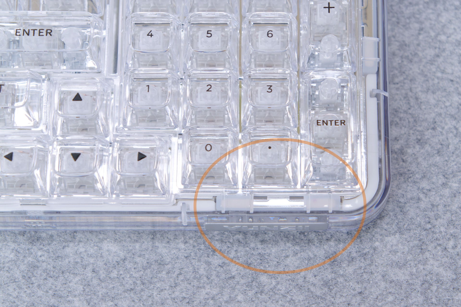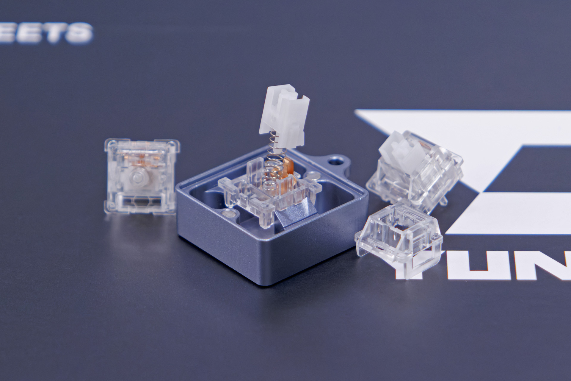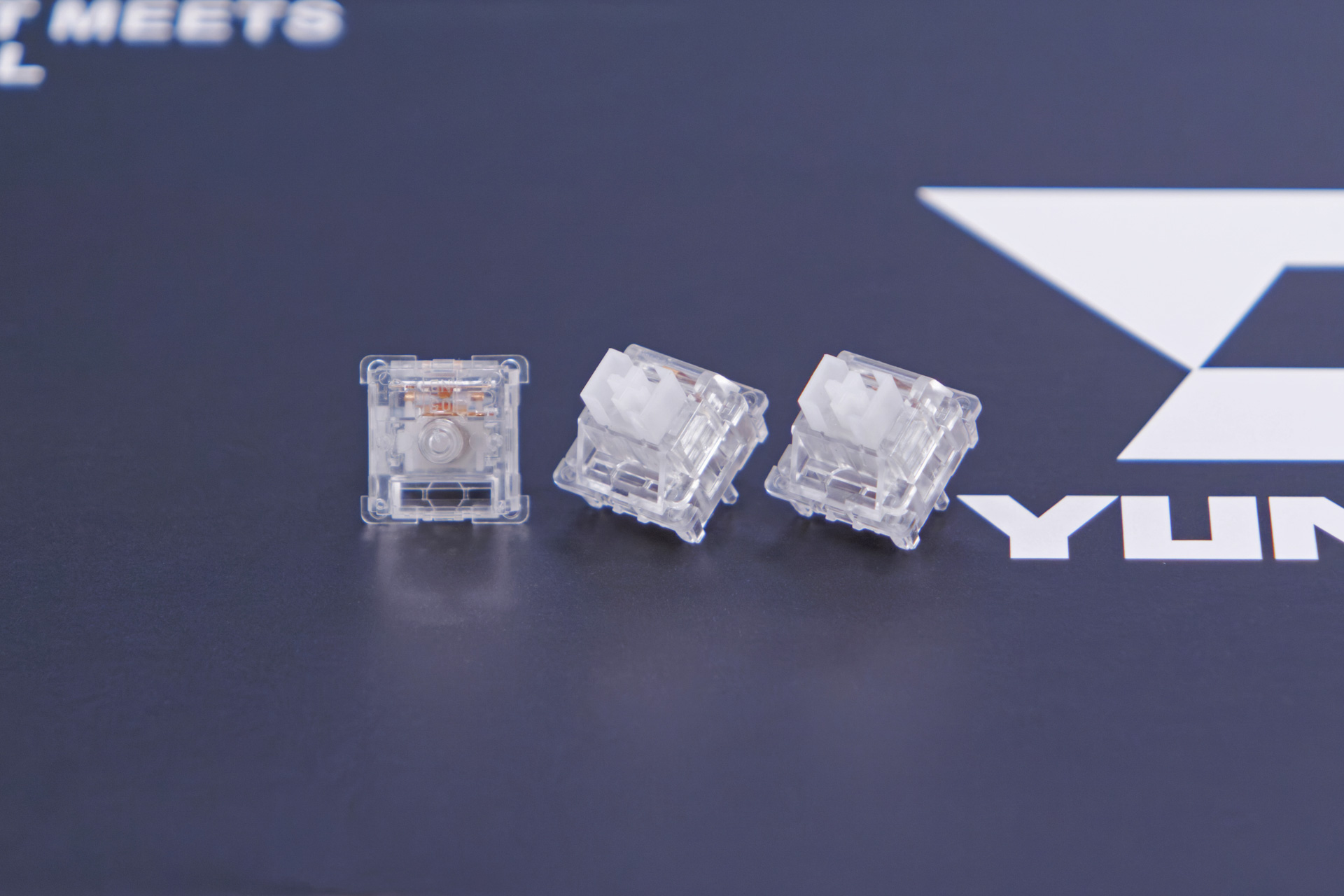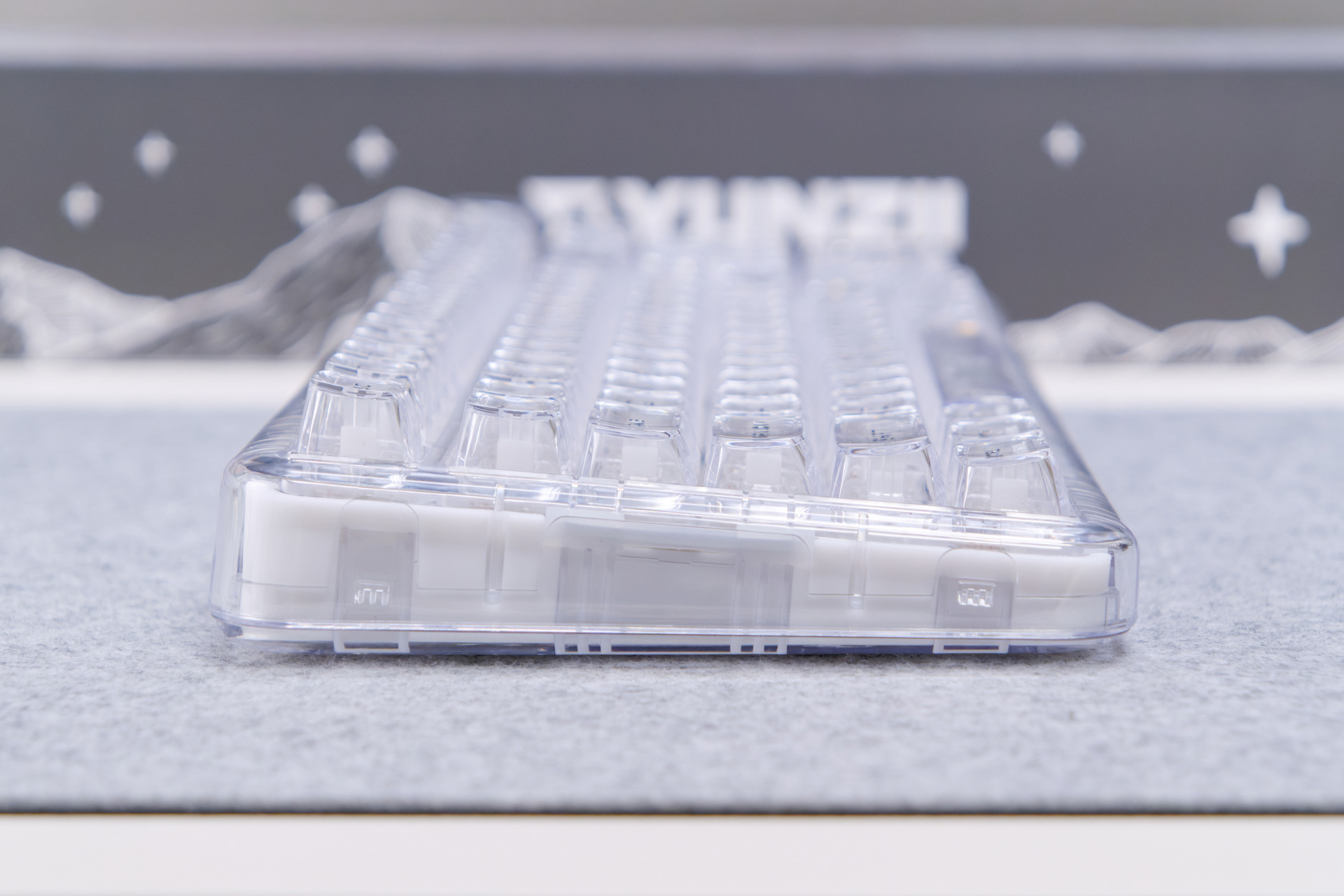 キーボード全体の透明デザインに合わせて、ハウジングも透明なPC素材を採用しています。こちらのスイッチは新しいという事もあるからか、YUNZIIの他モデルには採用されていません。むしろ、透明デザインに合わせるためだけに新しく作ったのでしょうか。