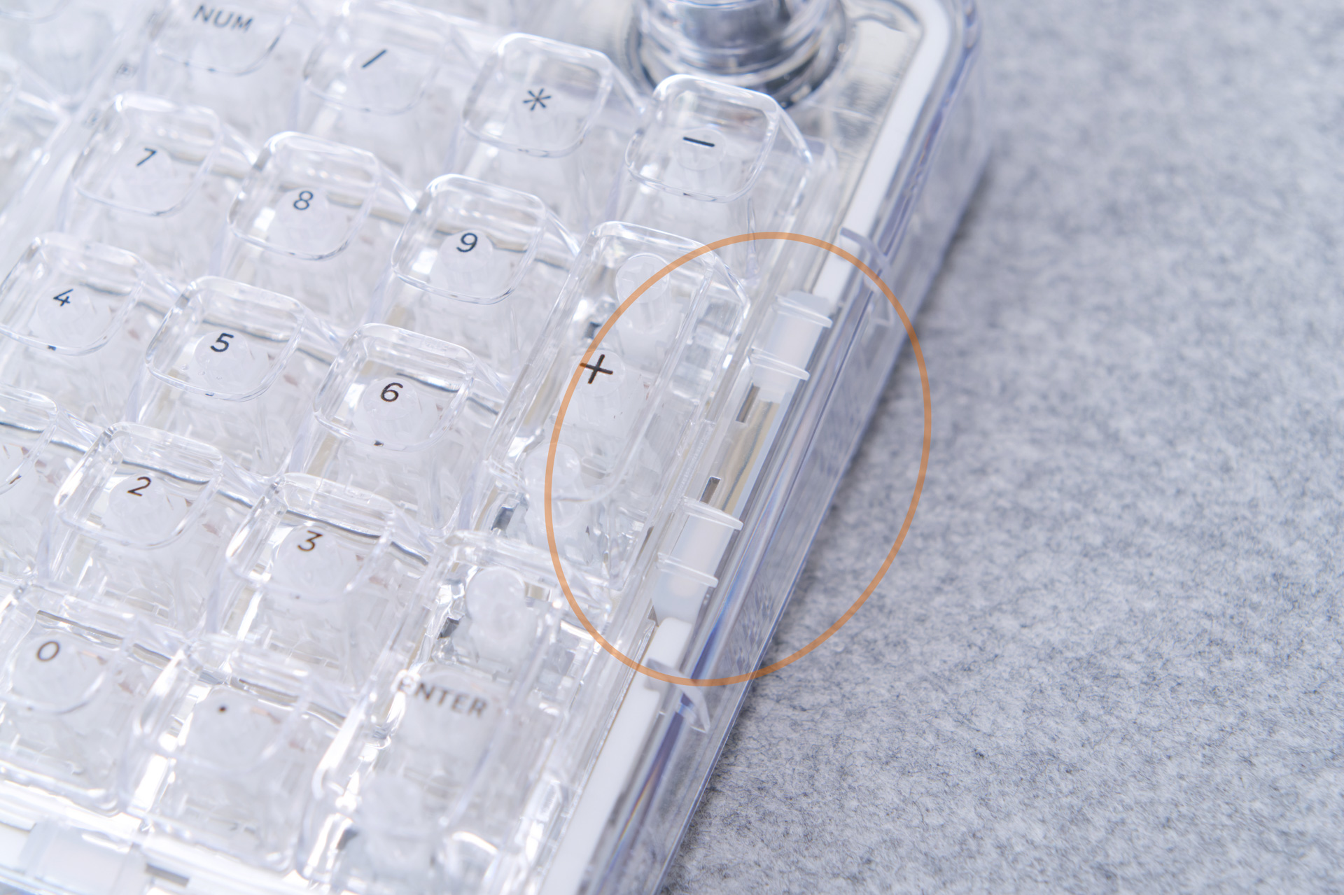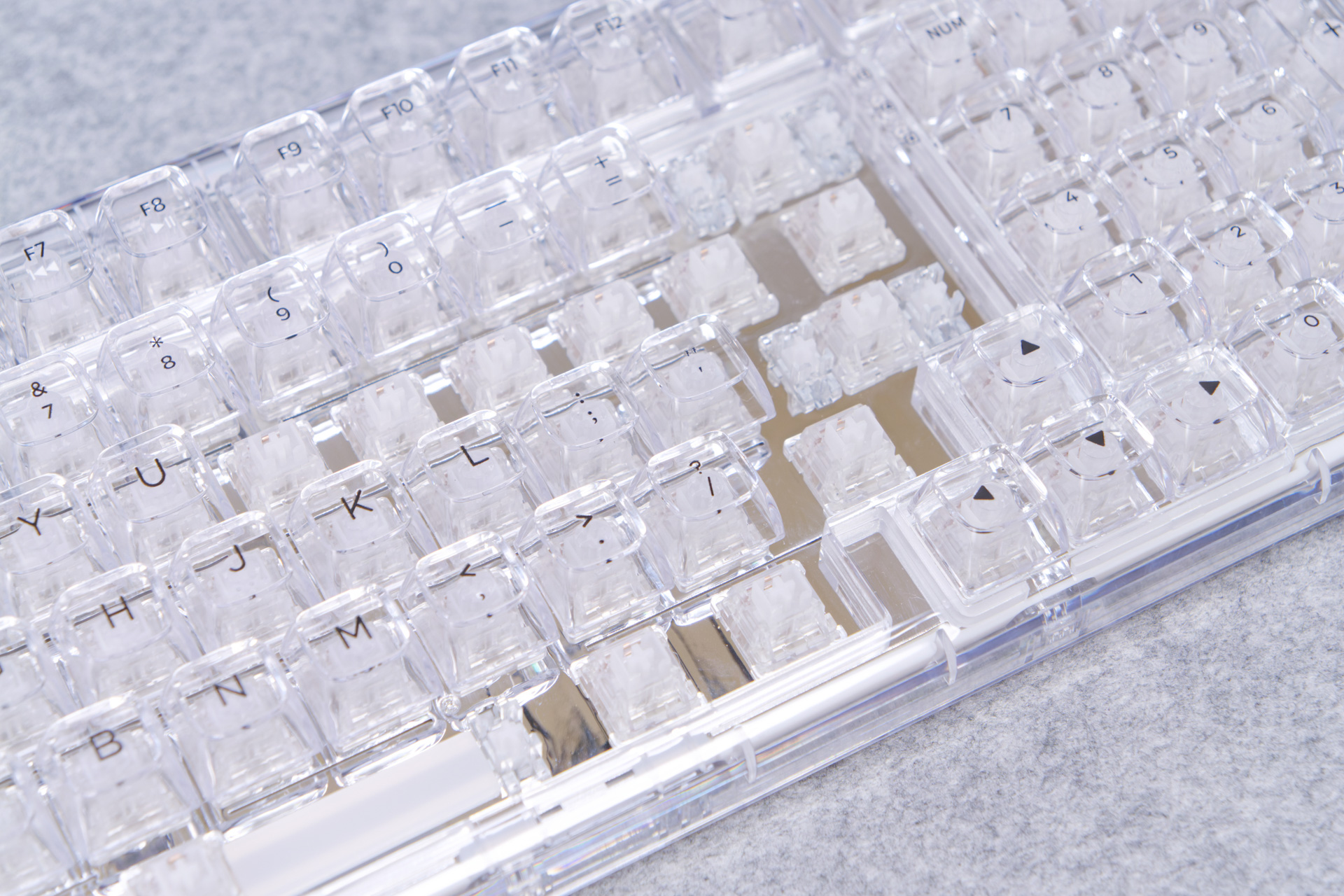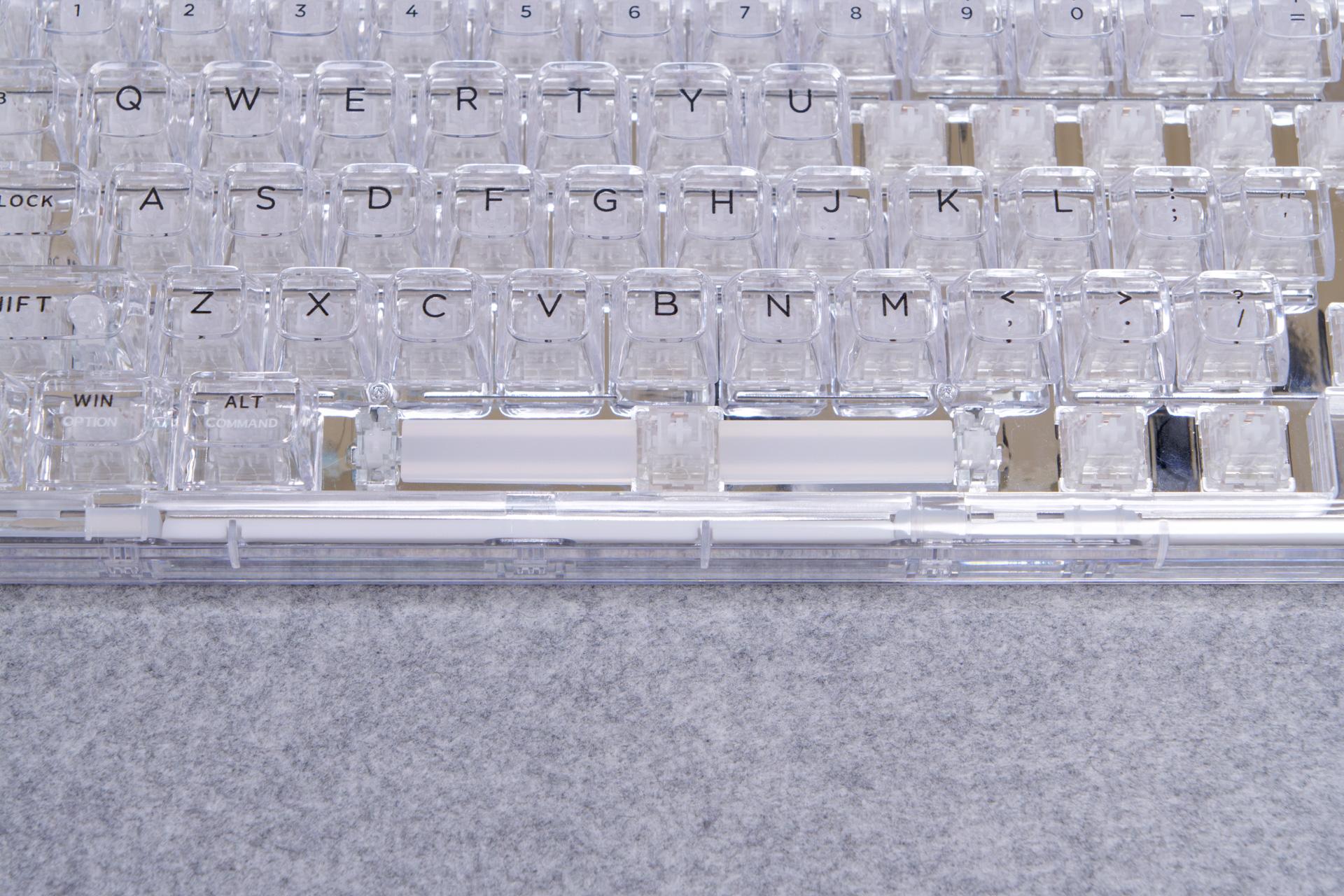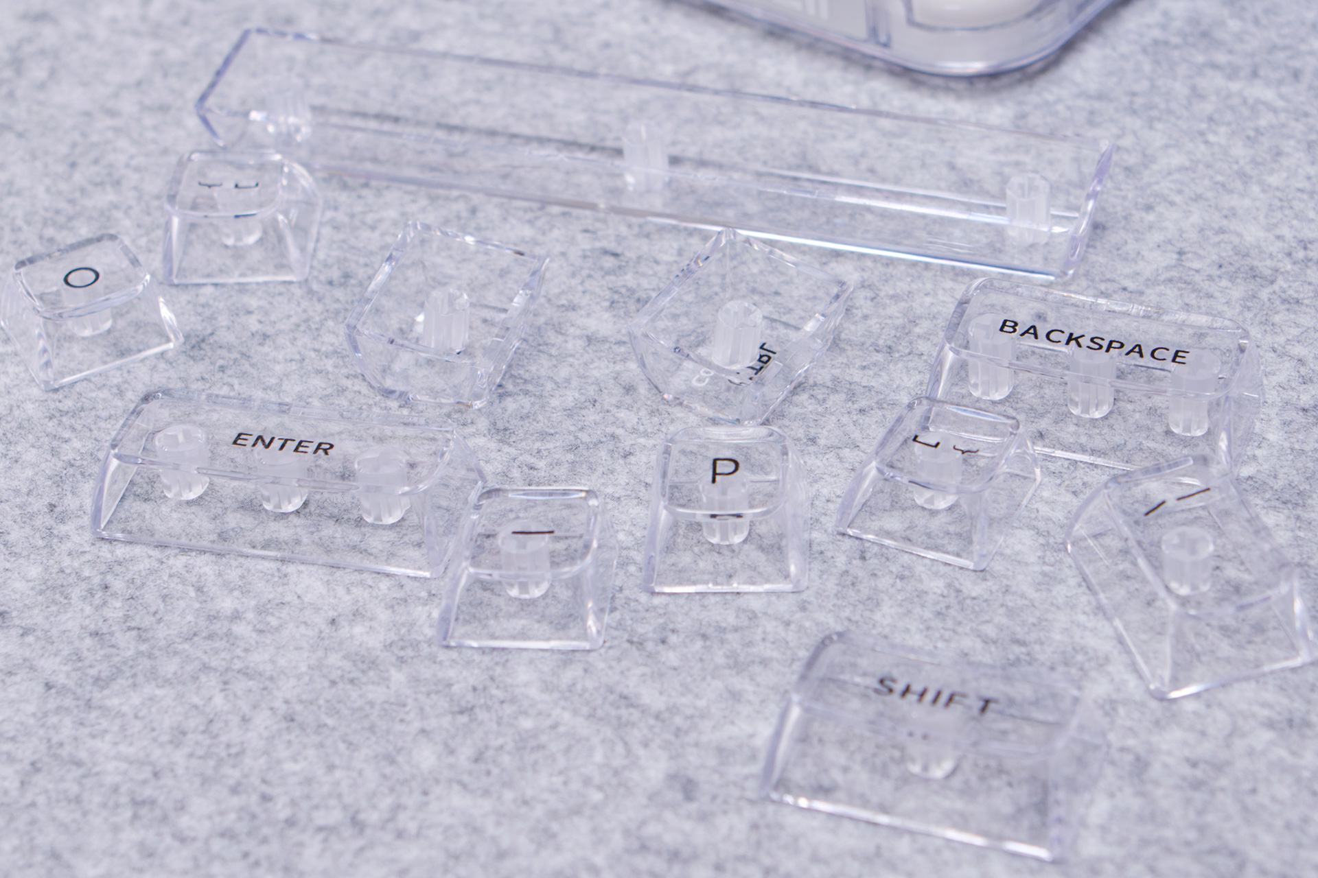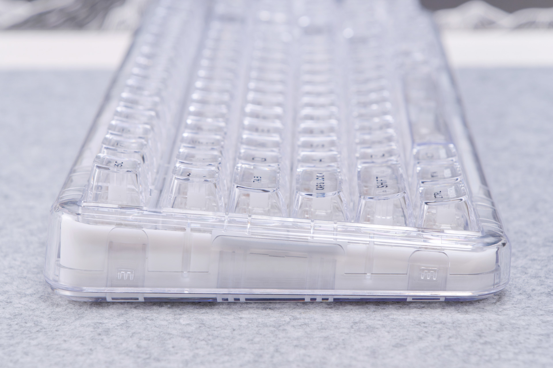 キーキャップも透過PC素材のクリアクリスタルキーキャップを採用しています。キーキャップの厚みは1.3~1.4mmあり、バリやゲート跡などもなくキレイな仕上がりでクオリティの高いキーキャップです。