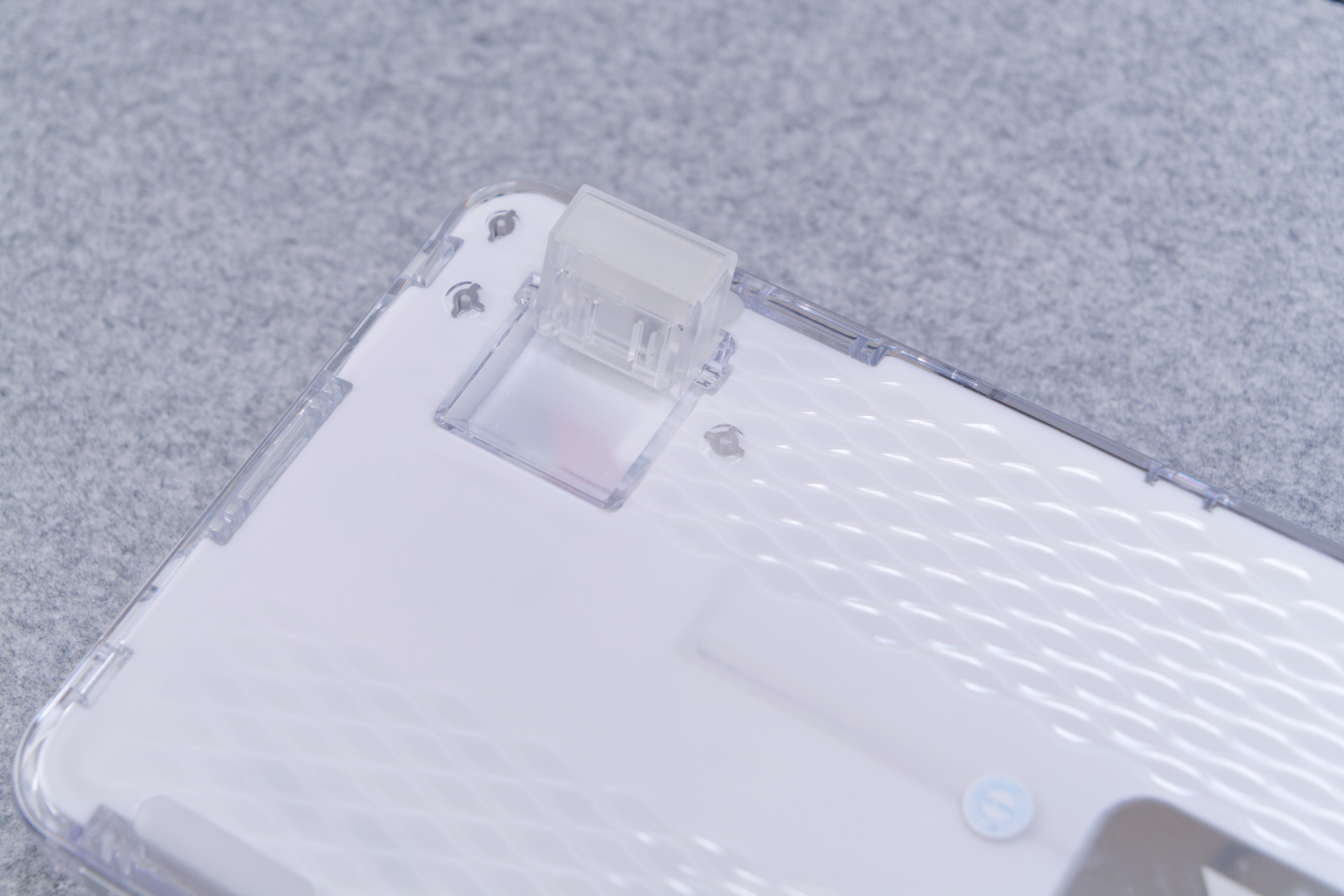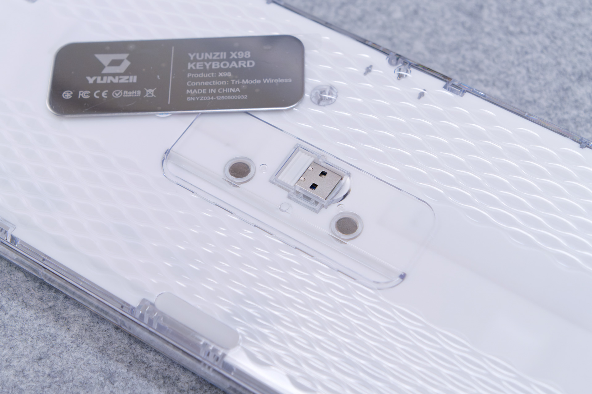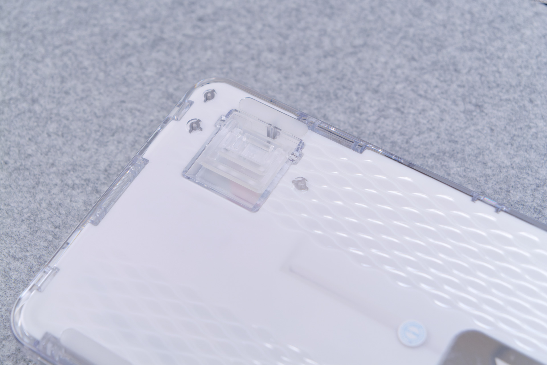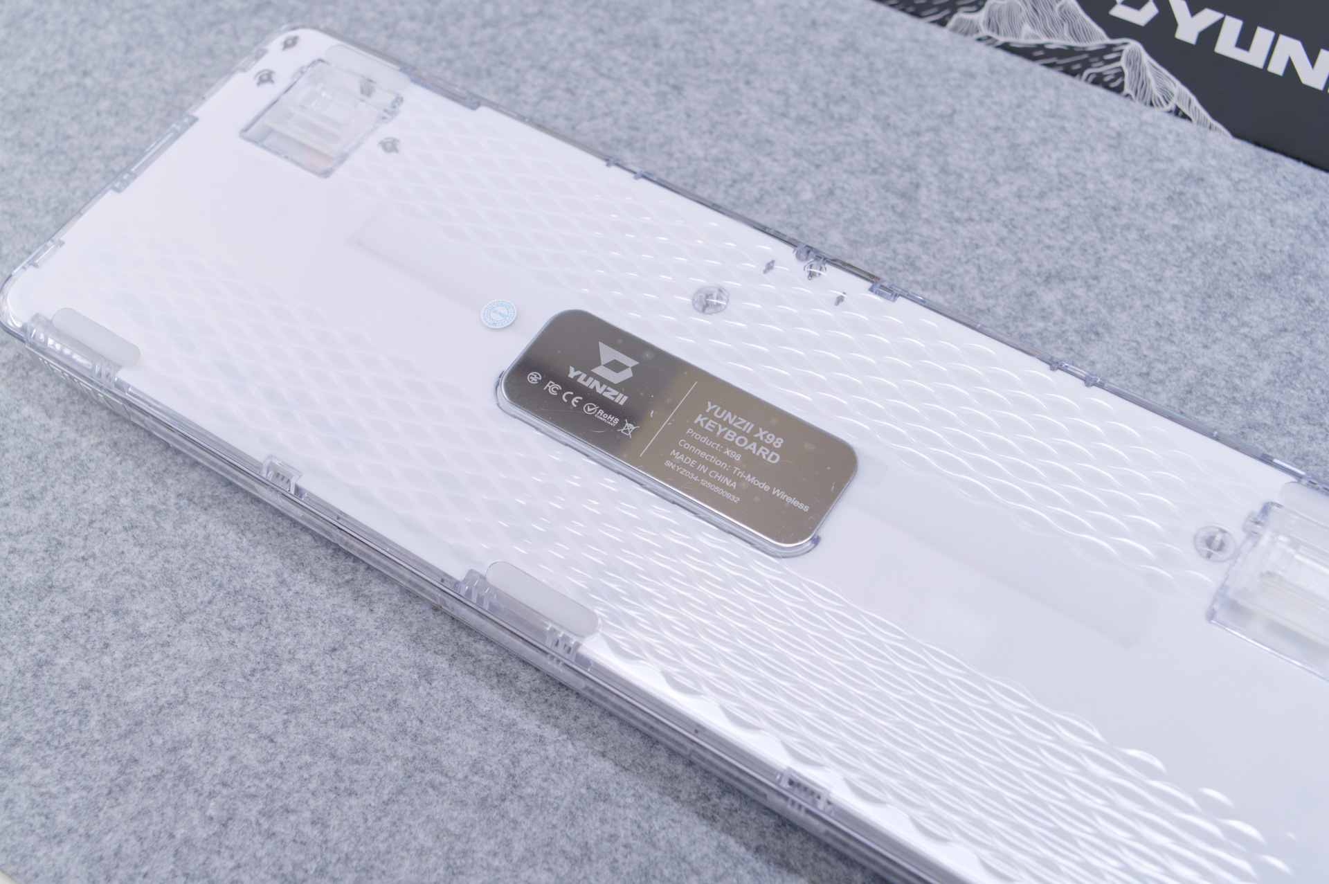 キーボード側面や背面を見ると、右側手前にYUNZIIロゴプレートが施されていたり、背面は鱗状の滑り止め加工がされていたりと、各所にこだわりが見えます。