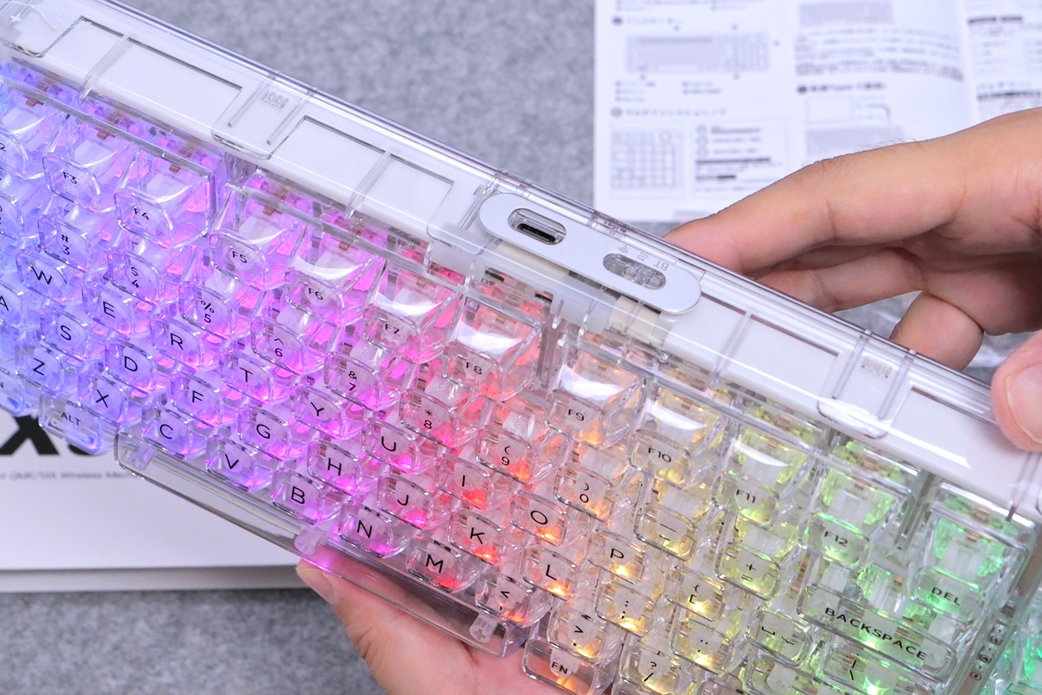 最大の特徴は、キーキャップを含めキーボード全体が透明なデザインという部分。RGBバックライトによって、まるで宝石のように輝き、デスク上で圧倒的な存在感を放ちます。さらに、QMK/VIAによるキーカスタマイズに対応しており、こちらは前モデルX71から進化したポイント。もちろん、日本国内でのワイヤレス接続に必須となる技適認証も取得済みです。