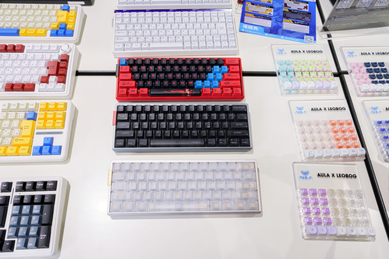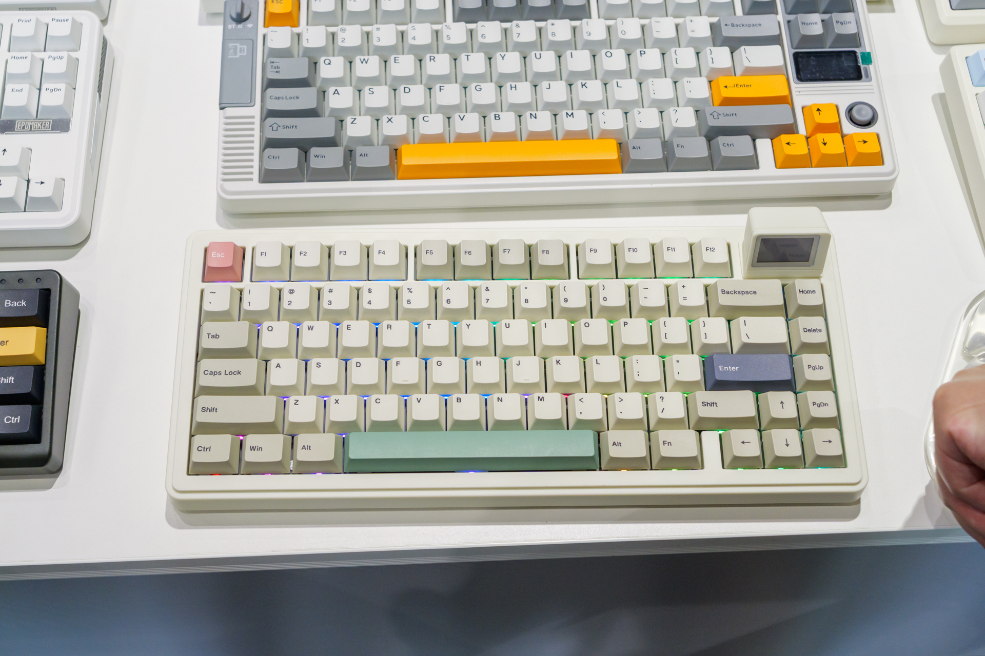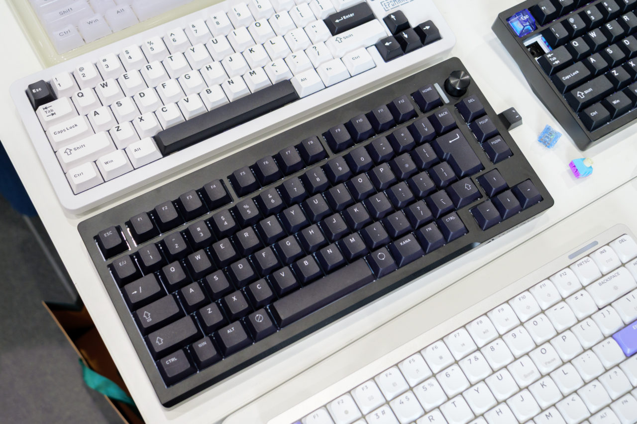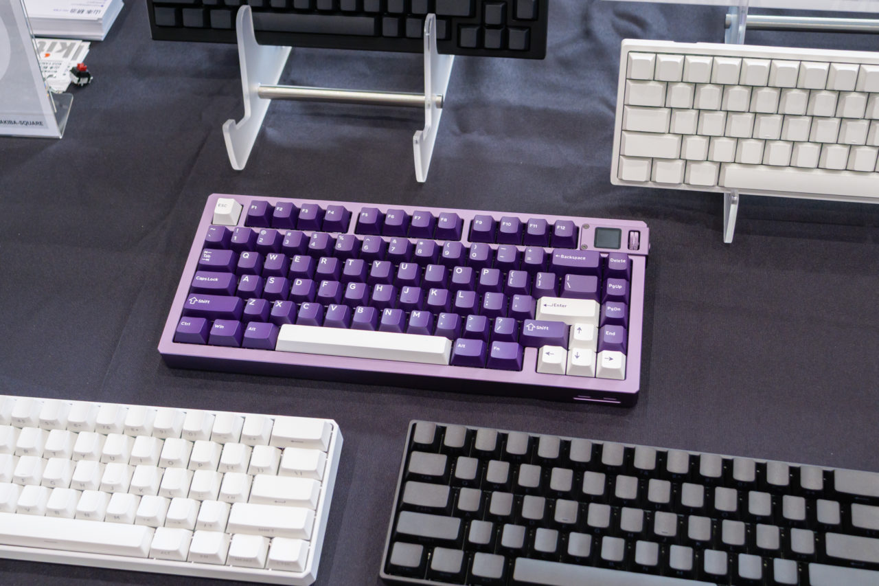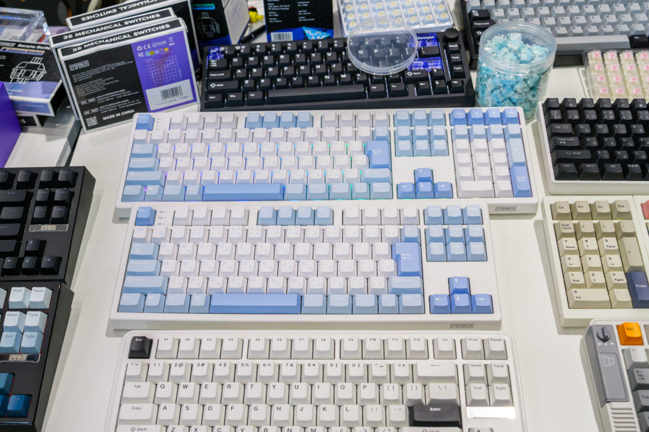 こちらは日本語JIS配列モデルです。まだ機種名は分かりませんが、上の写真のホワイト/ブルーの機種はフルサイズと80%TKLのバリエーションがあるようです。左下が80%TKL(廉価モデルっぽい)と75%(アルミニウム製)の合計4機種の日本語JIS配列モデルを予定しているとのこと。本当に日本語配列が増えてきましたね。