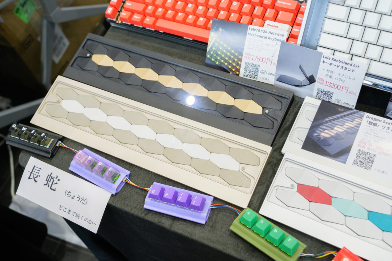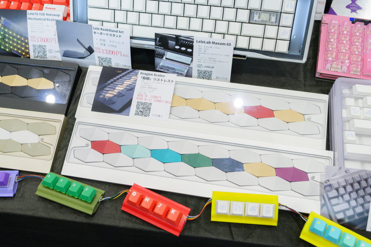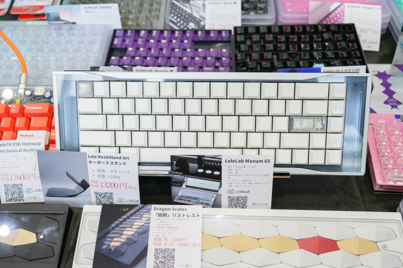 LeleLabは可愛い袋を配布していて凄まじい混み具合でした。Dragon ScalesリストレストやHokkaido White、Kamakura Aoiキーキャップを目当てに来ていたようです。私もその一人で、キーキャップを買っていこうと思っていたのですが、写真1枚目のキーボード Maxum65 に見入ってしまいました。美しすぎます。