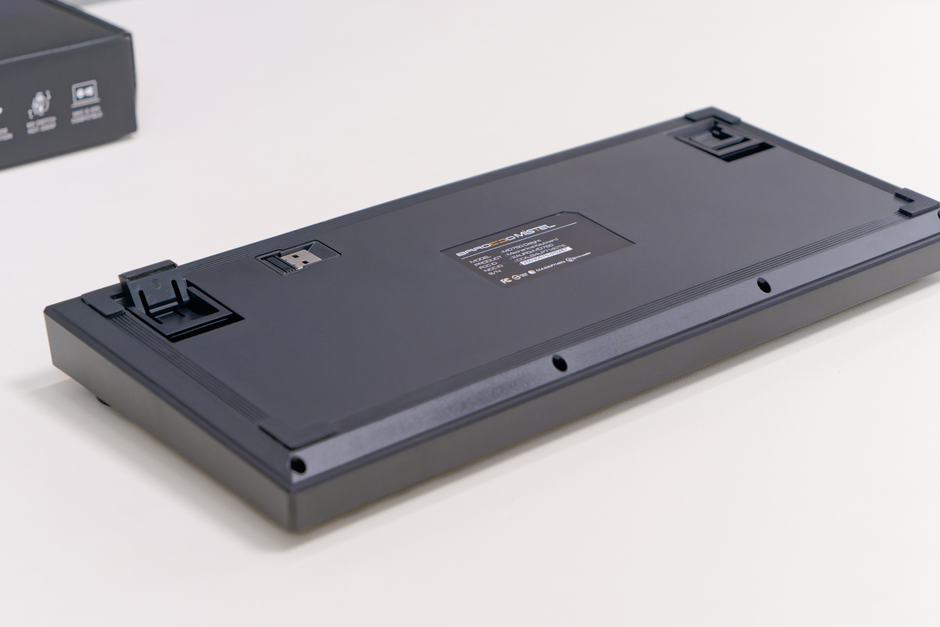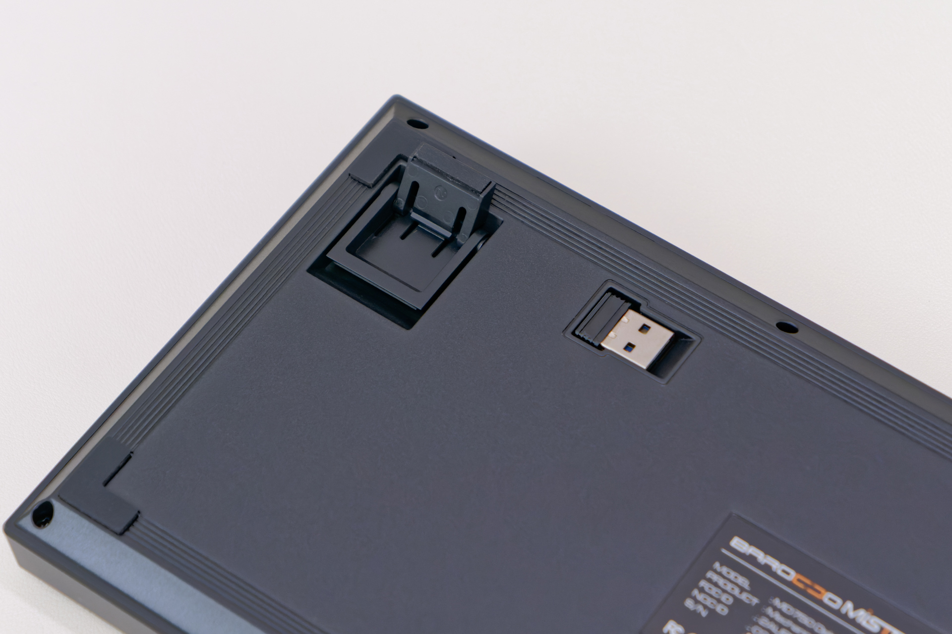 キーボード背面はボトムプレートなどは無くシンプルなデザイン。2.4Gドングル収納と2段階キックスタンドが付いています。また中央の銘板には技適認証マーク・番号が記載されています。