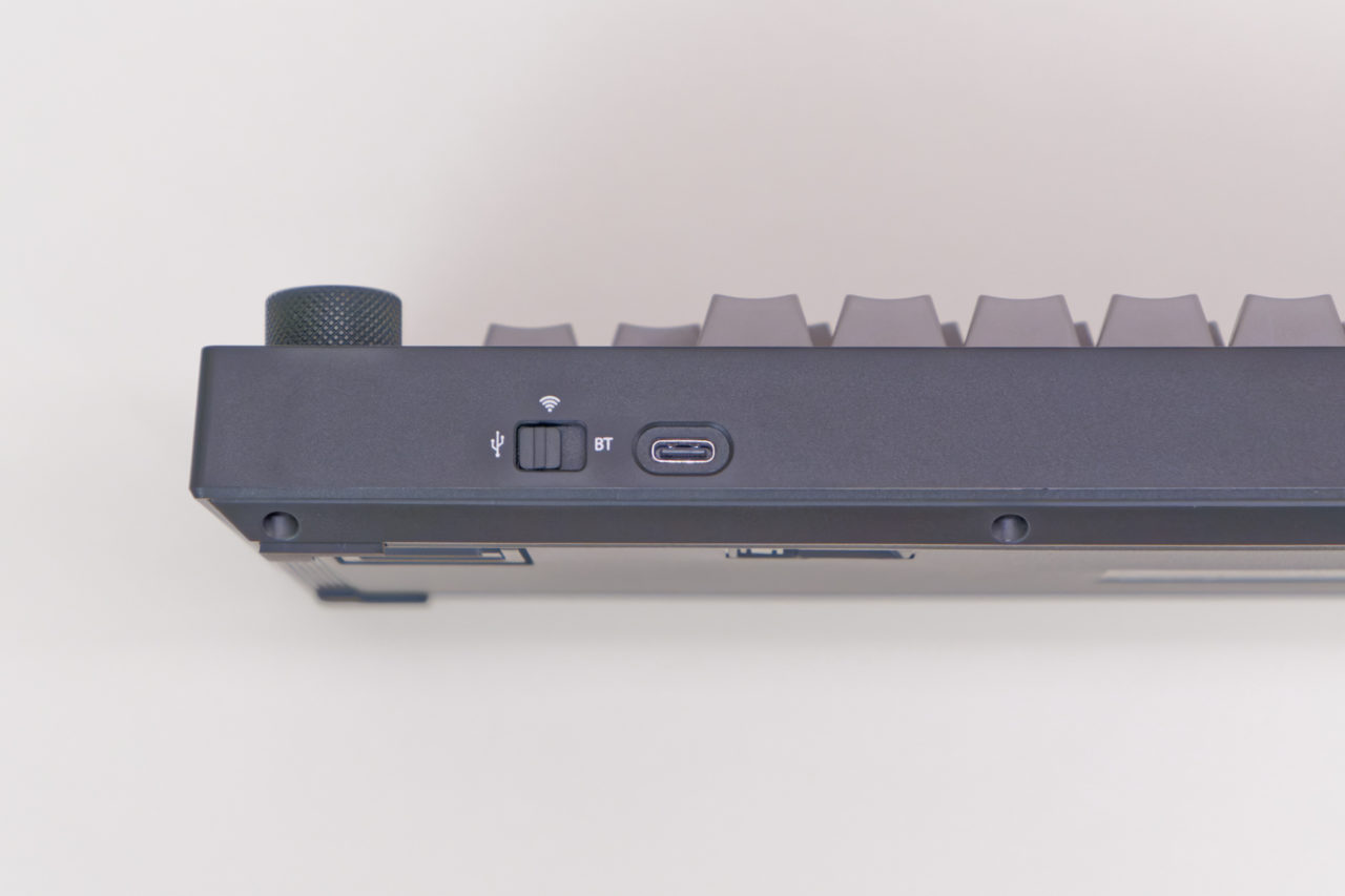 こちらのコネクタとスイッチは、ノブの奥側にまとまっています。3モード(USB有線 / 2.4GHz / Bluetooth 5.0ワイヤレス)対応で、Bluetoothは3台のデバイスを登録(Fn+1 / 2 / 3)できるので、使用環境に合わせて利用できます。また、技適認証も取得されているため、国内でのワイヤレス接続利用も安心です。