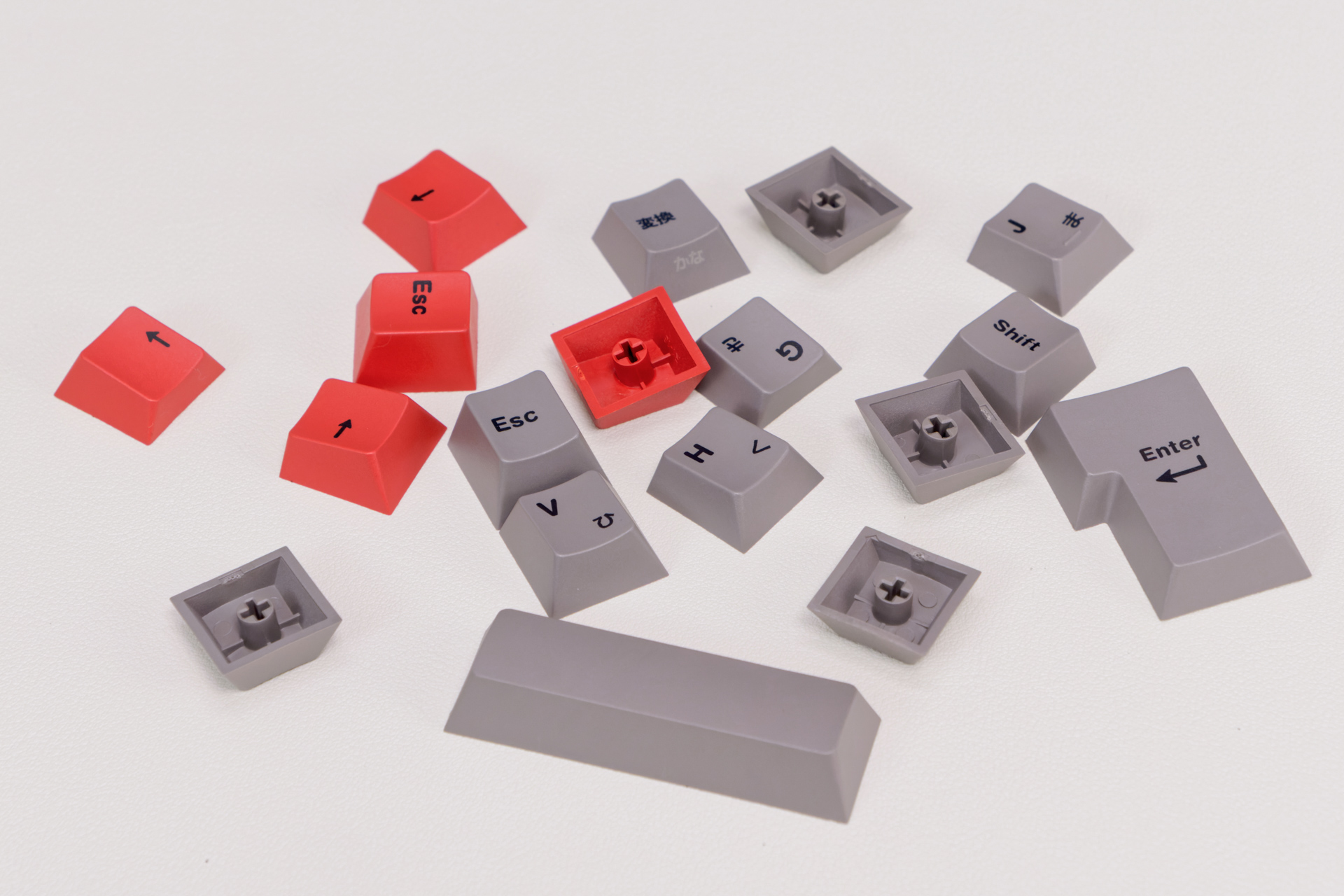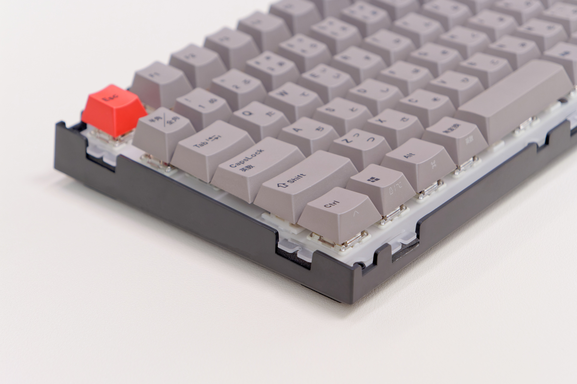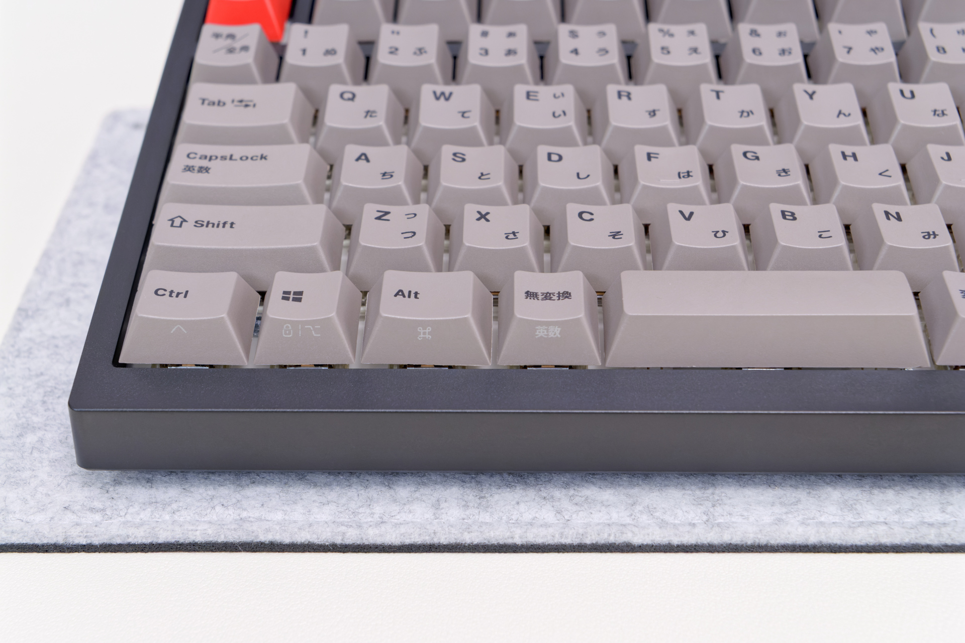 デフォルトキーキャップには「かな印字」があり、The Rockという名前からも岩のようなイメージが伝わってきます。付属する交換用の赤いキーキャップが良いアクセントになっています。シンプルなデザインなので、キーキャップ交換することでガラッと雰囲気は変わると思います。