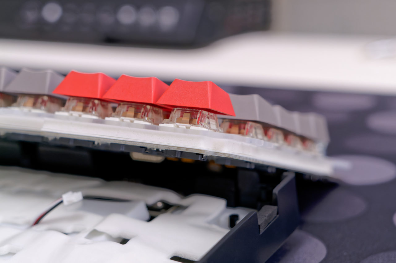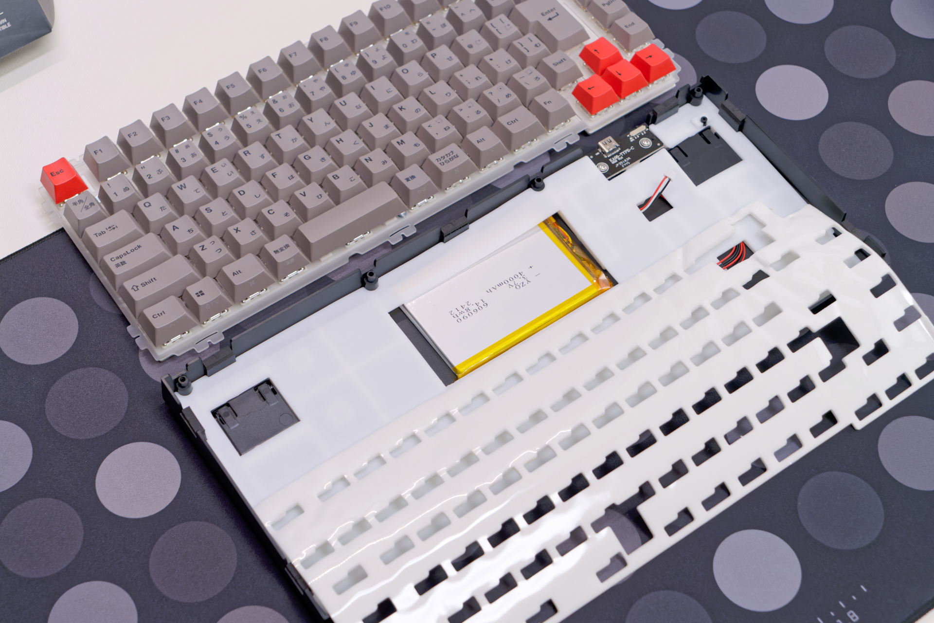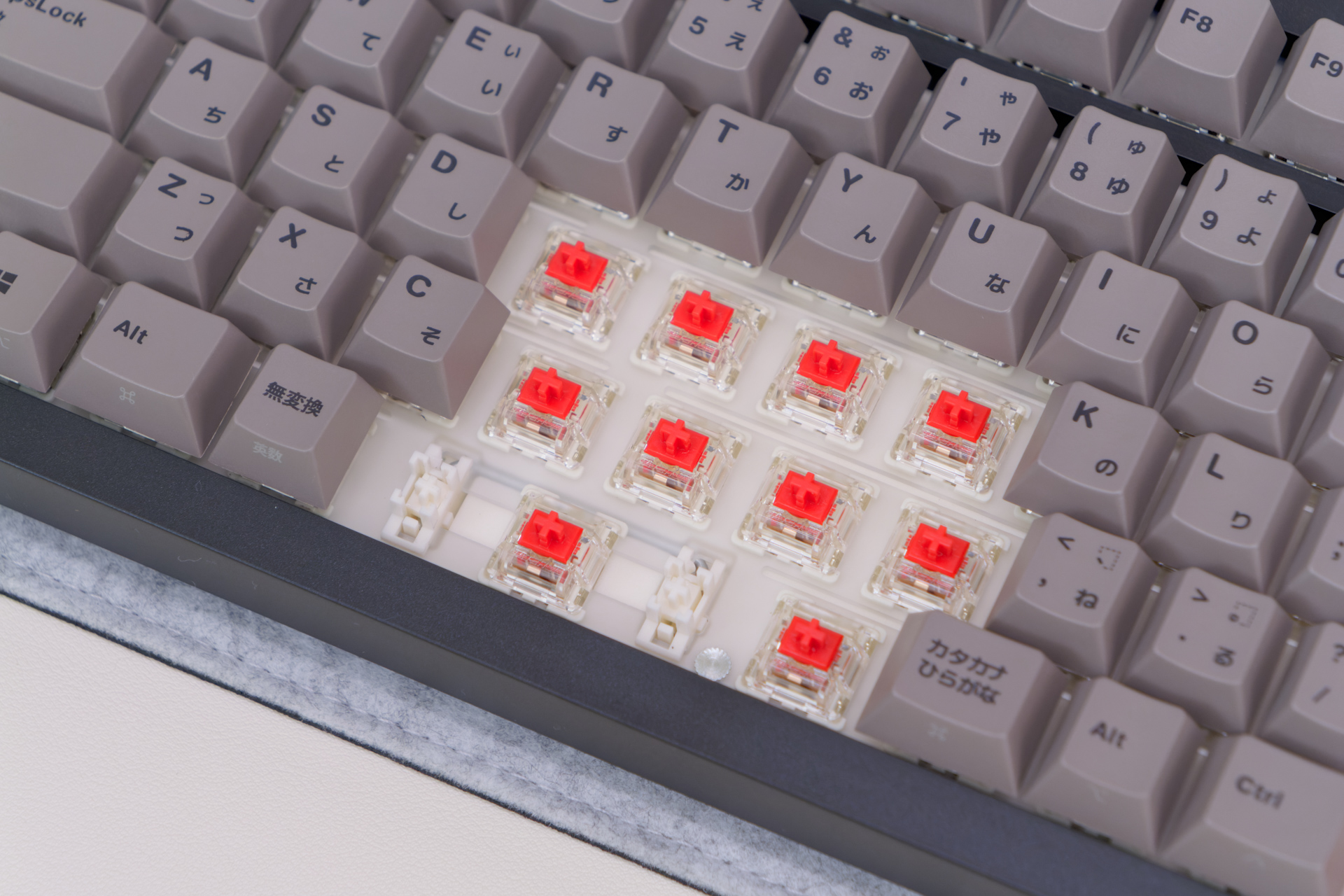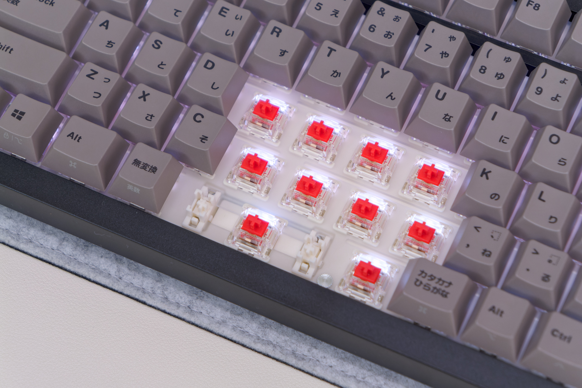 スタビライザーはしっかりとルブされているため、金属音など異音がすることはなく、大きいサイズのキーもキレイな音です。また、スペースバー配下にもフォームが敷き詰められて静音処理されていました。