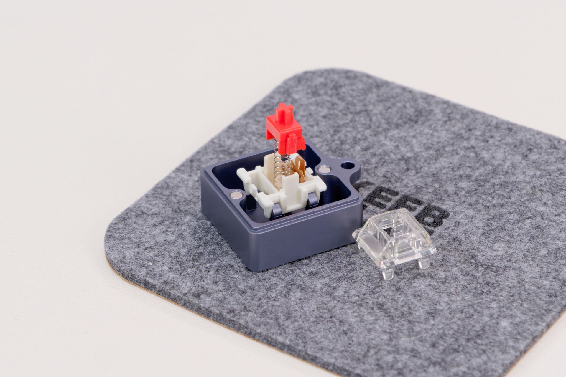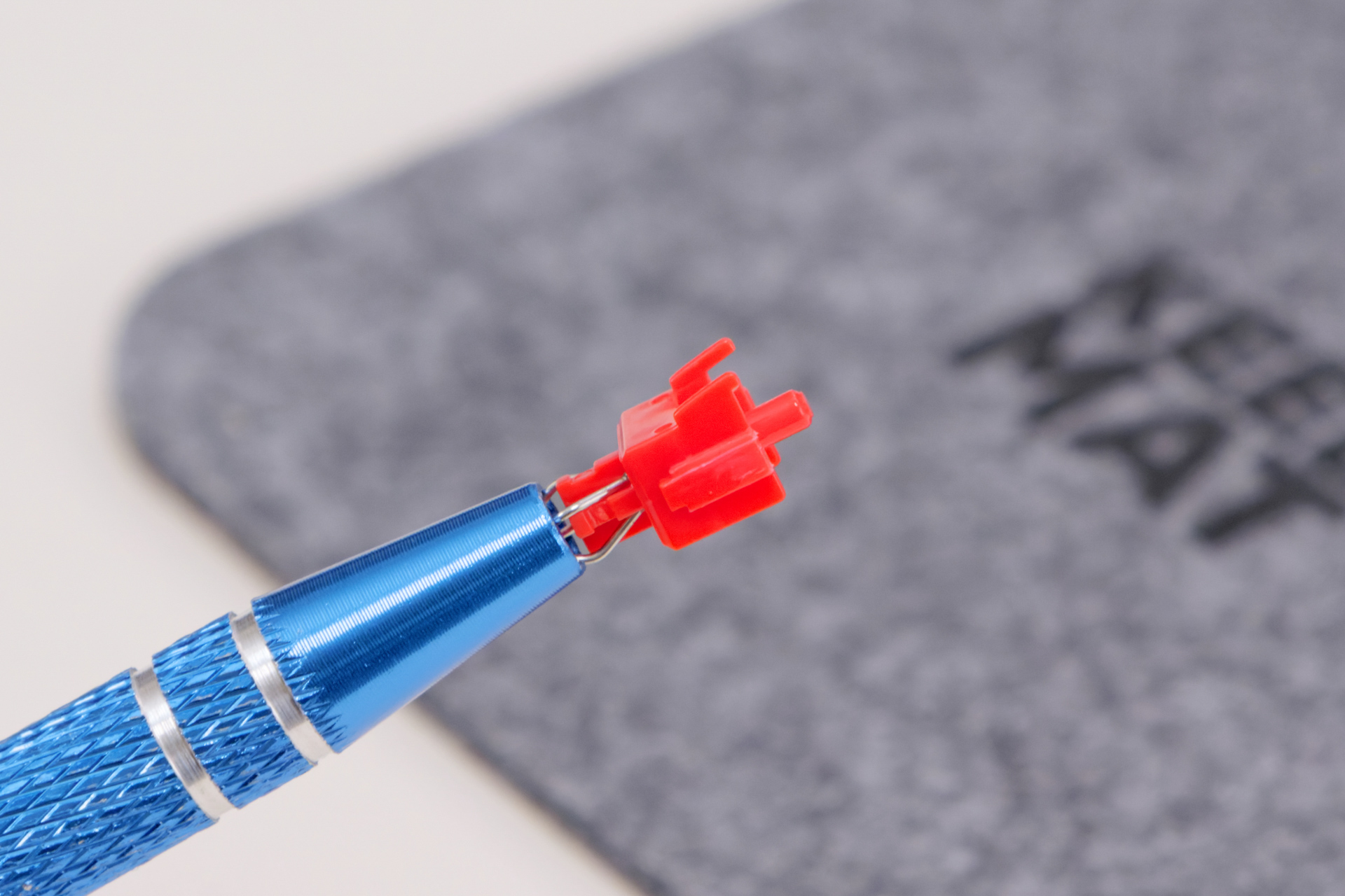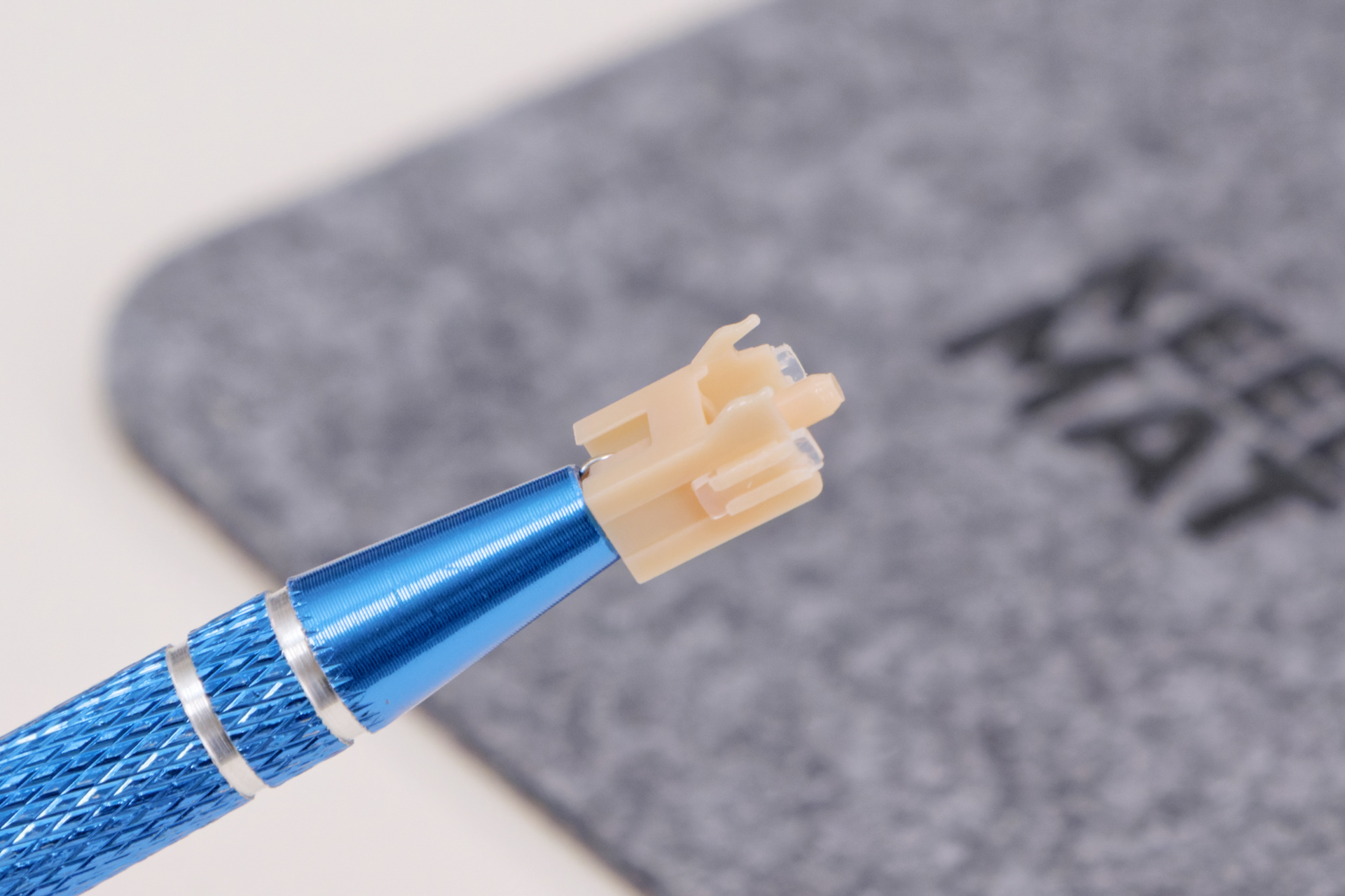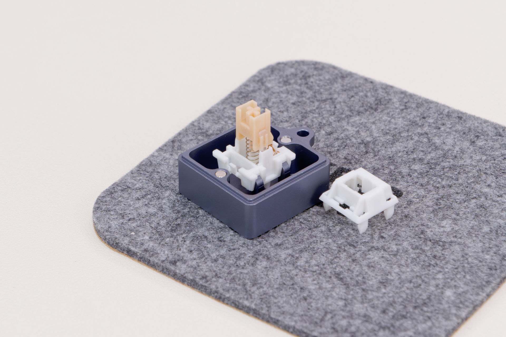 静音スイッチはメーカーによってステムの仕掛けが異なるため、分解して構造確認をしたところ、ステムガイド部分の上下にシリコンのようなショック吸収材が施されているタイプのようです。大きめの吸収材が付いているので、シリコン感強めかなと思ったら、それほどシリコン感は強くないというか、フワッとした感覚と言った方が正しいかもしれません。