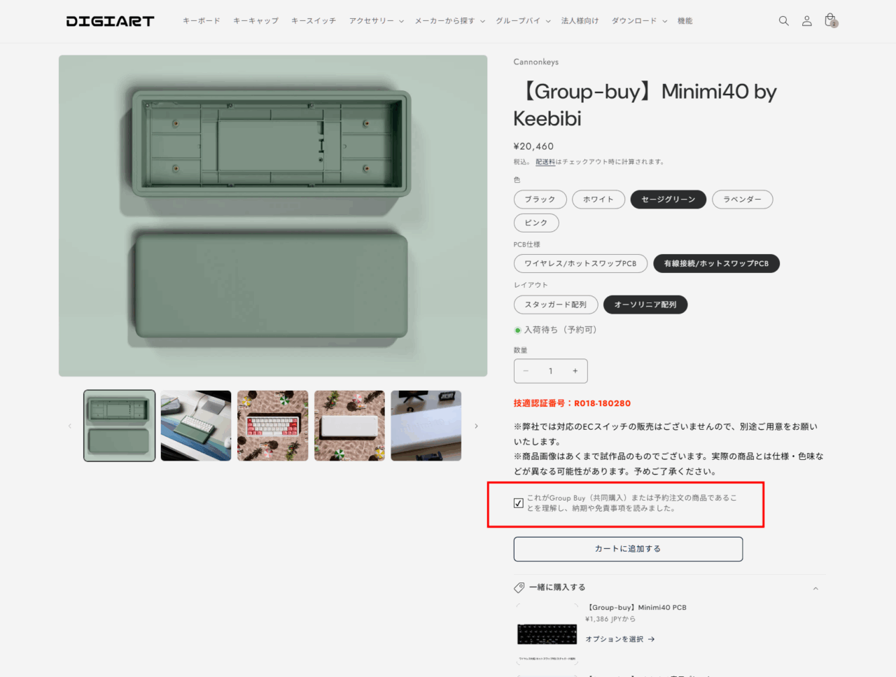 上の画像の赤枠のチェックボックスにチェックを入れると「カートに追加する」というボタンが活性化されます。