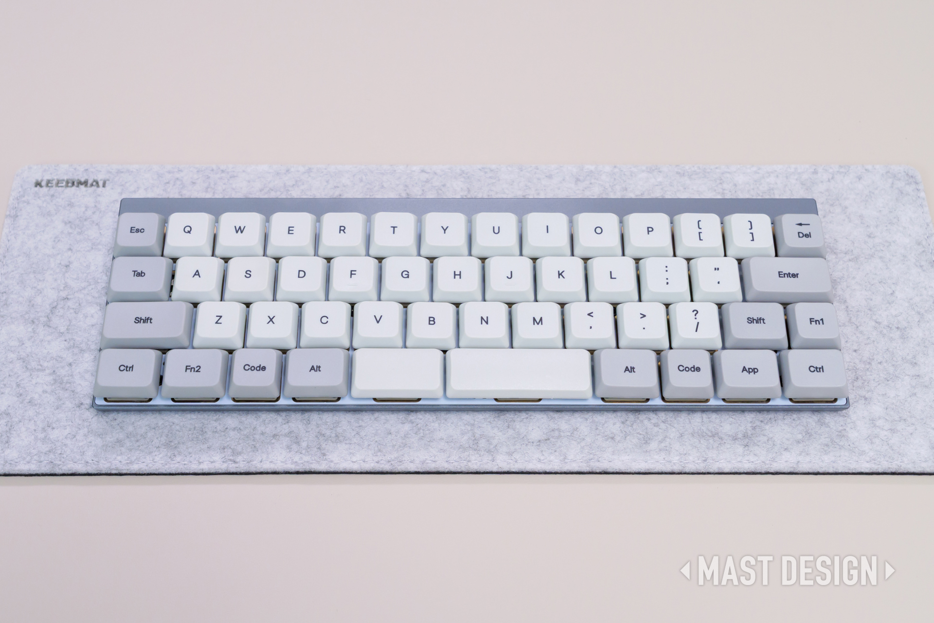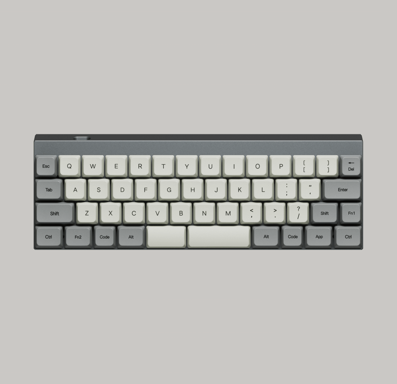 レトログレーのキーキャップは「ライトグレー × グレー」のツートン構成で、アルミケースの落ち着いたガンメタと組み合わせると、かなりエモい雰囲気になります。