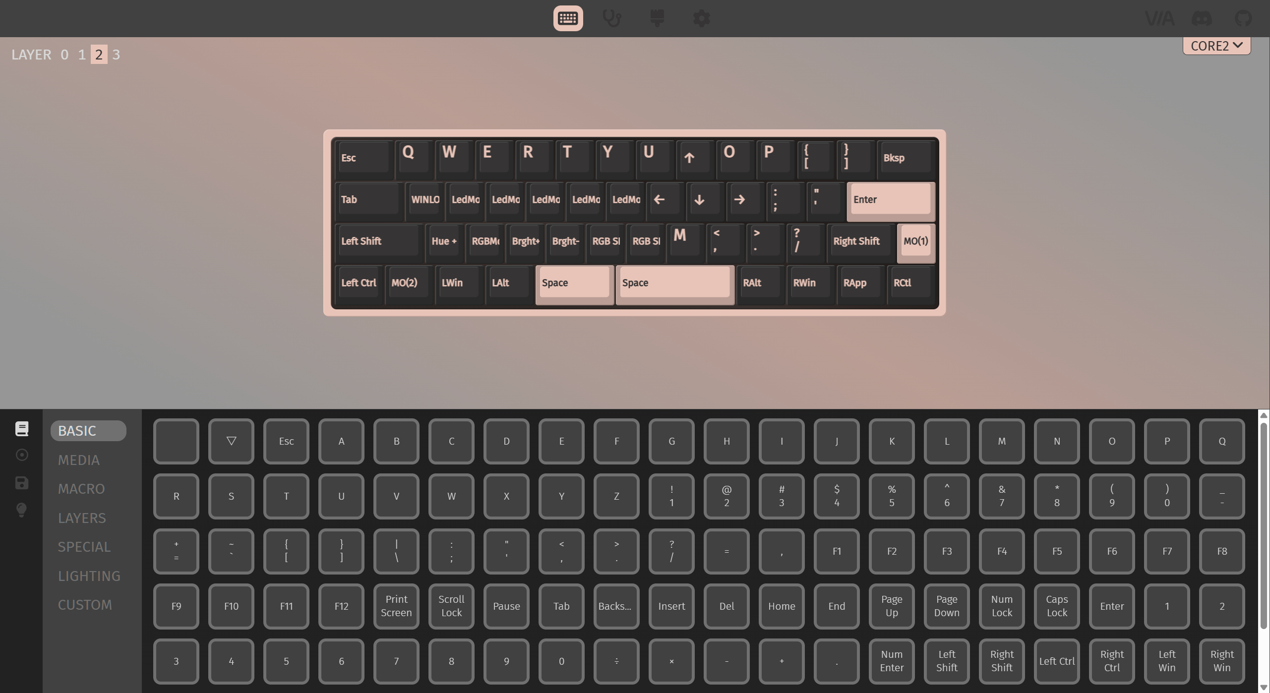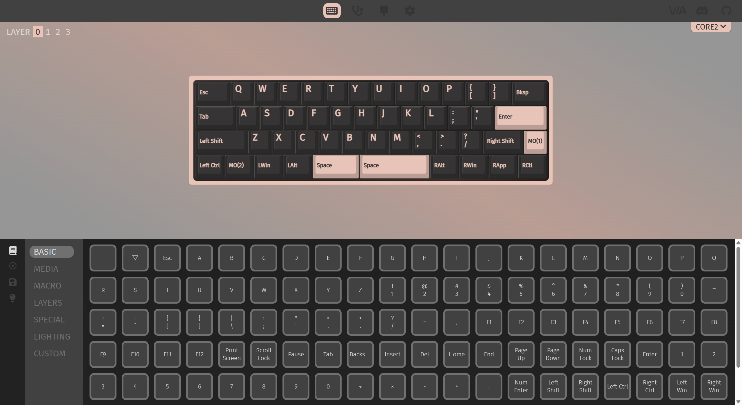 Core PlusはVIAに対応しているため、キーの割り当てを自由にカスタマイズできます。