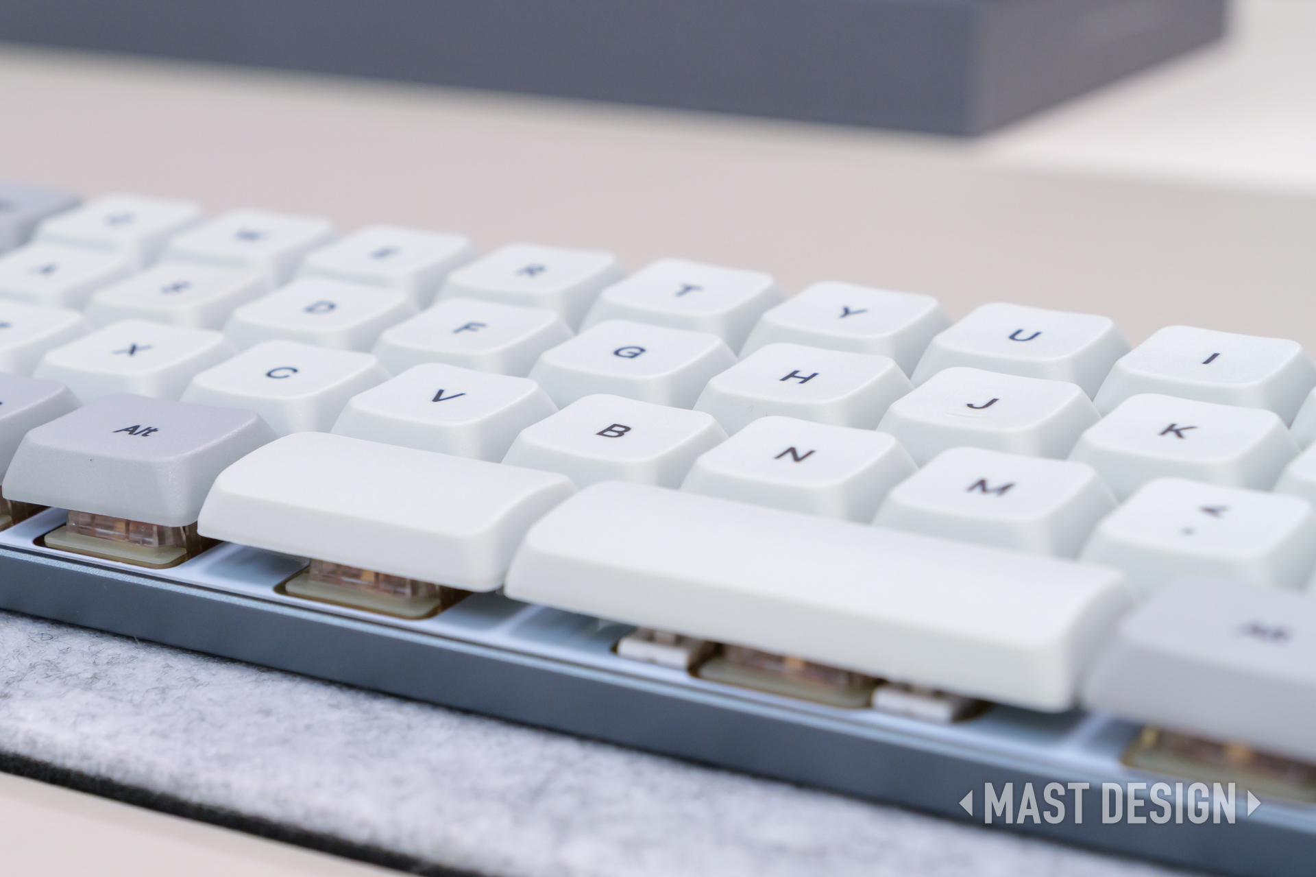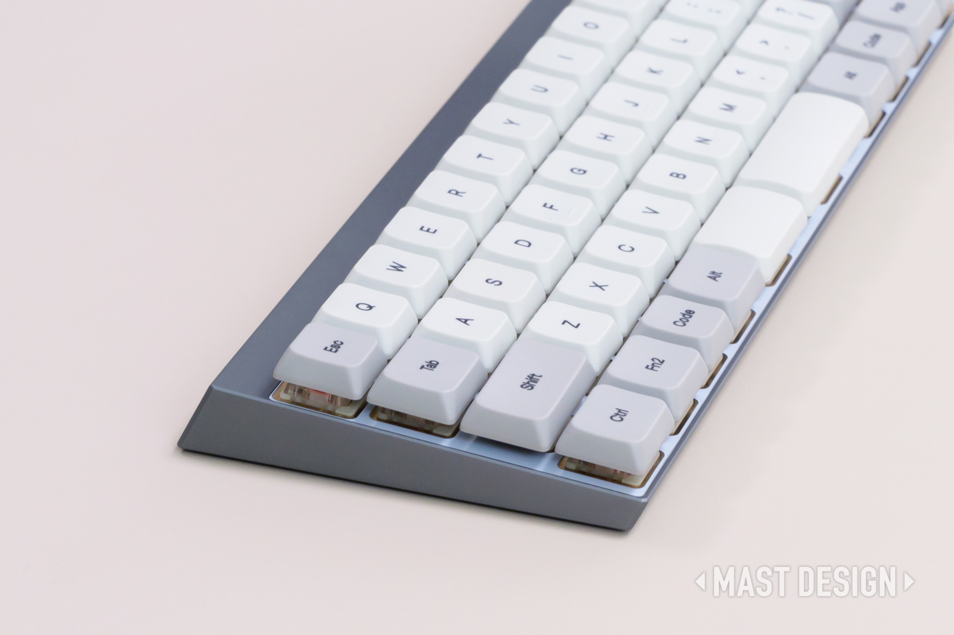 側面から見るとスイッチとFR4プレートがそのまま見えるため、上品さとメカっぽさが絶妙に混ざった雰囲気がたまらないです。