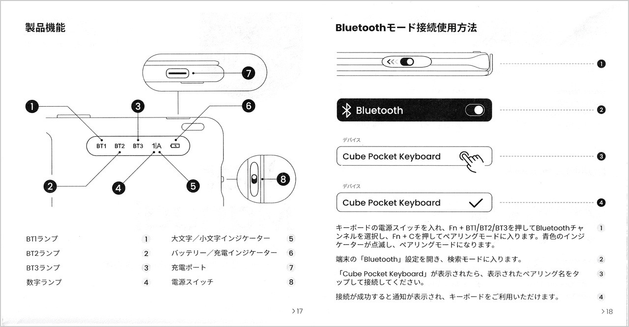 Fn+Q / W / EでBT1~BT3を切り替えFn+Cでペアリングモード- デバイス側で「Cube Pocket Keyboard」を選択して完了