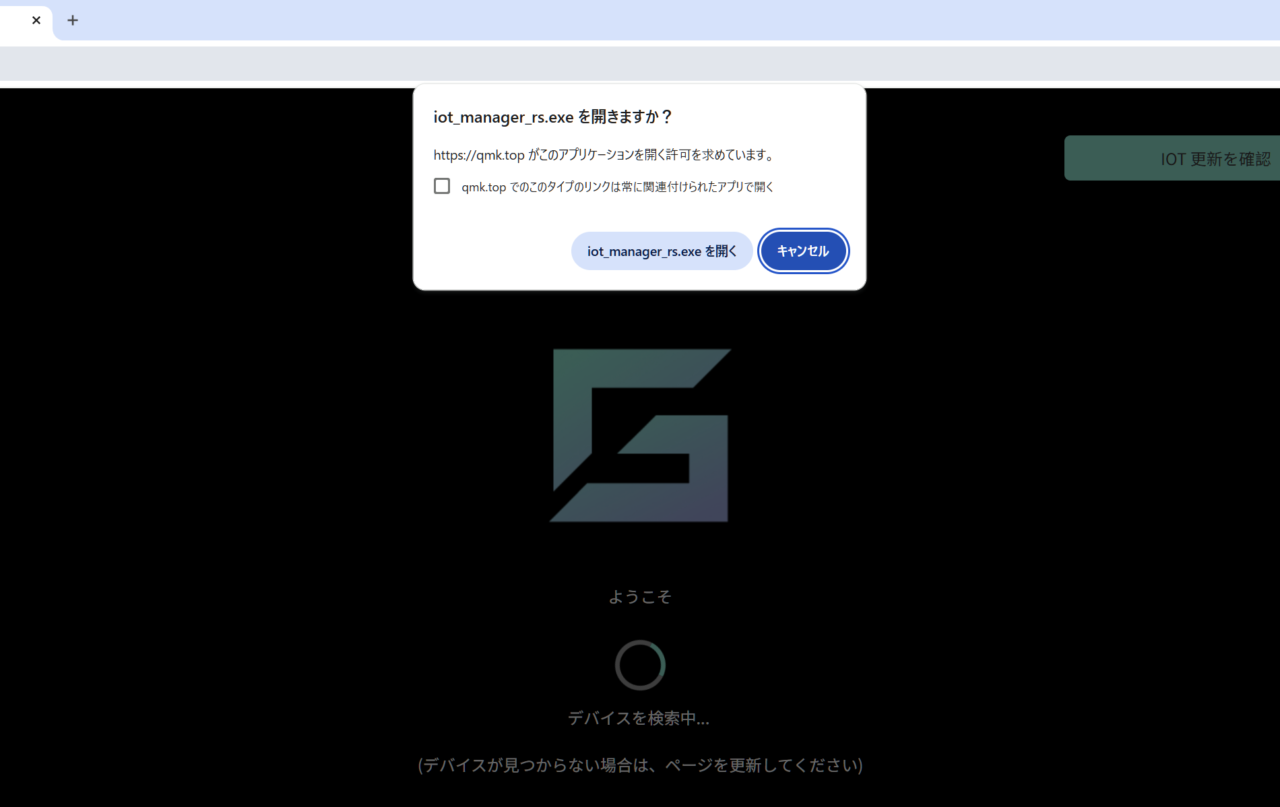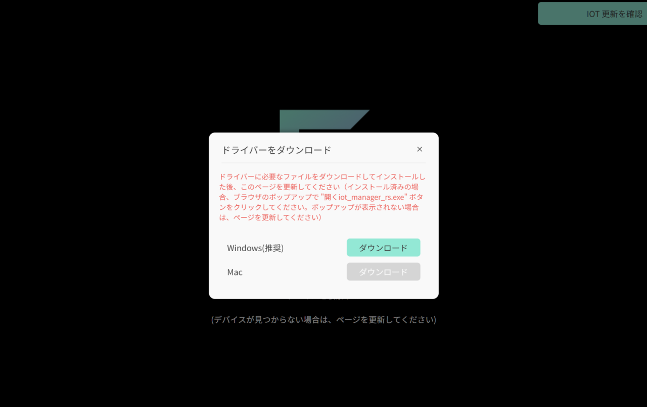 ② ドライバーソフトを起動する際には「iot_manager_rs.exeを開きますか?」と出てくるので、バックグラウンドでアプリを開く必要があります。