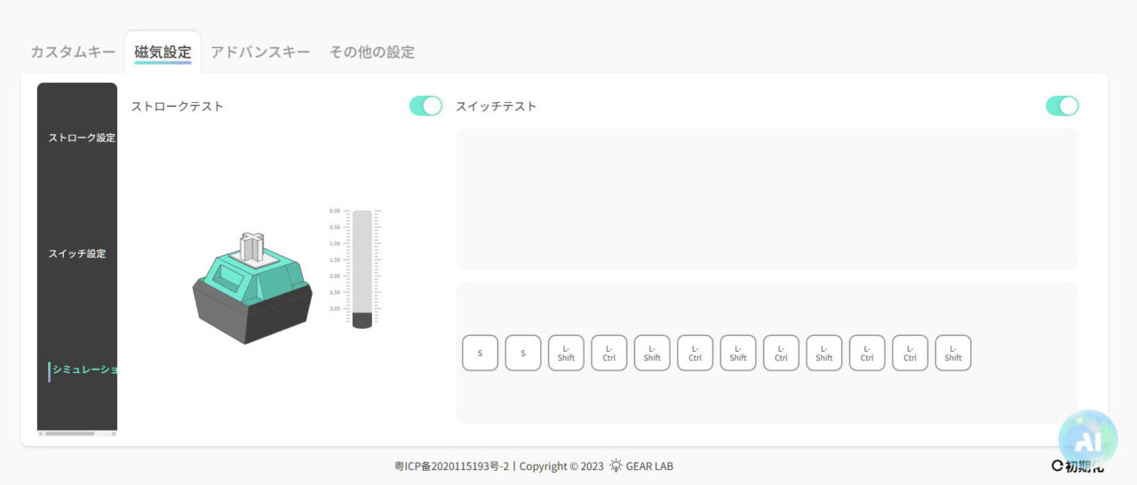 こちらのドライバーでは、アクチュエーションポイント 0.1mm~3.3mmに設定可能です。本来はスイッチスペックとしては総トラベル3.5mmのはずですが、ボトム0.2mmがデッドソーン的なソフトウェア制御がされているようです。(もう一つのドライバーでは3.5mmまで設定可能です)
