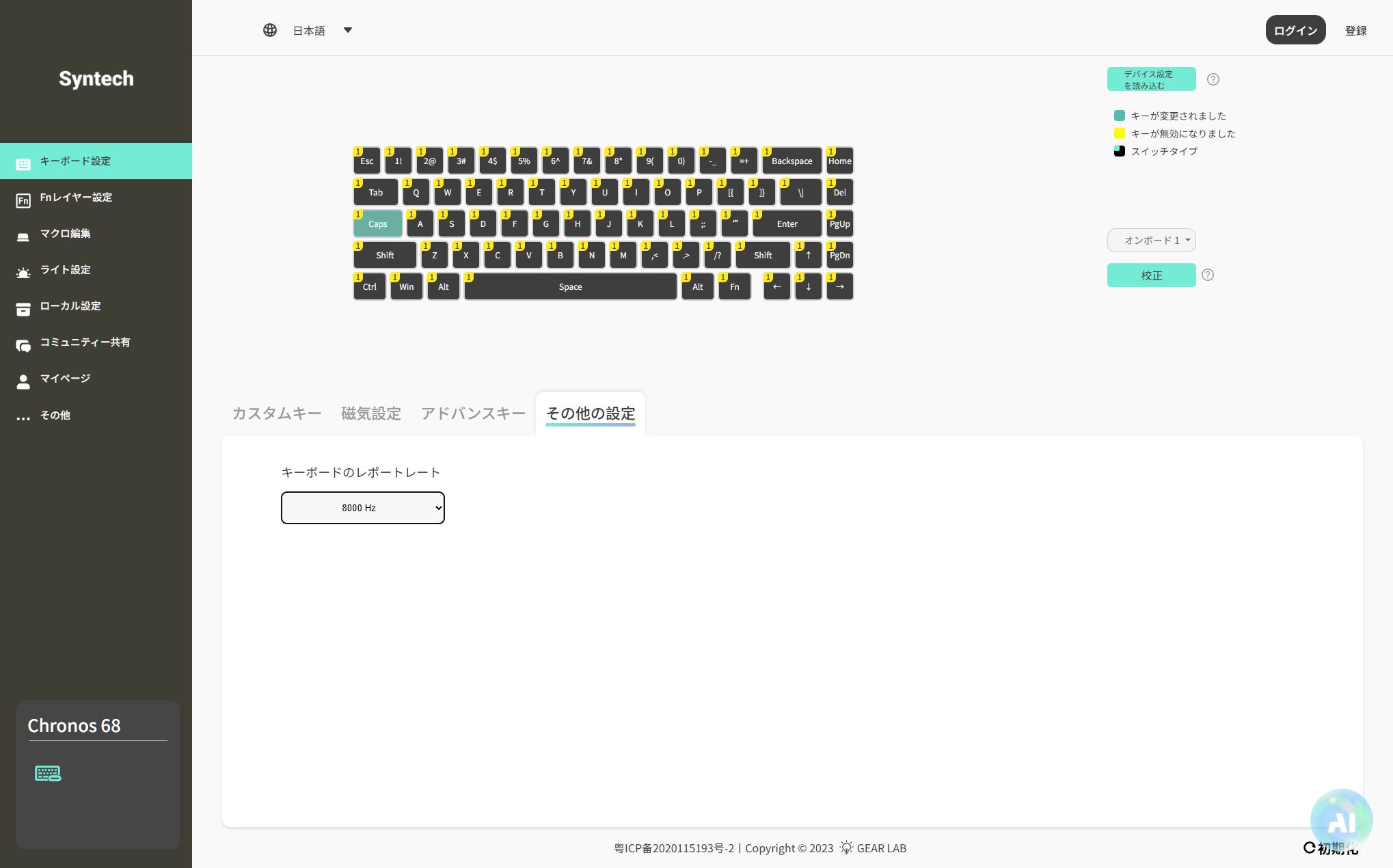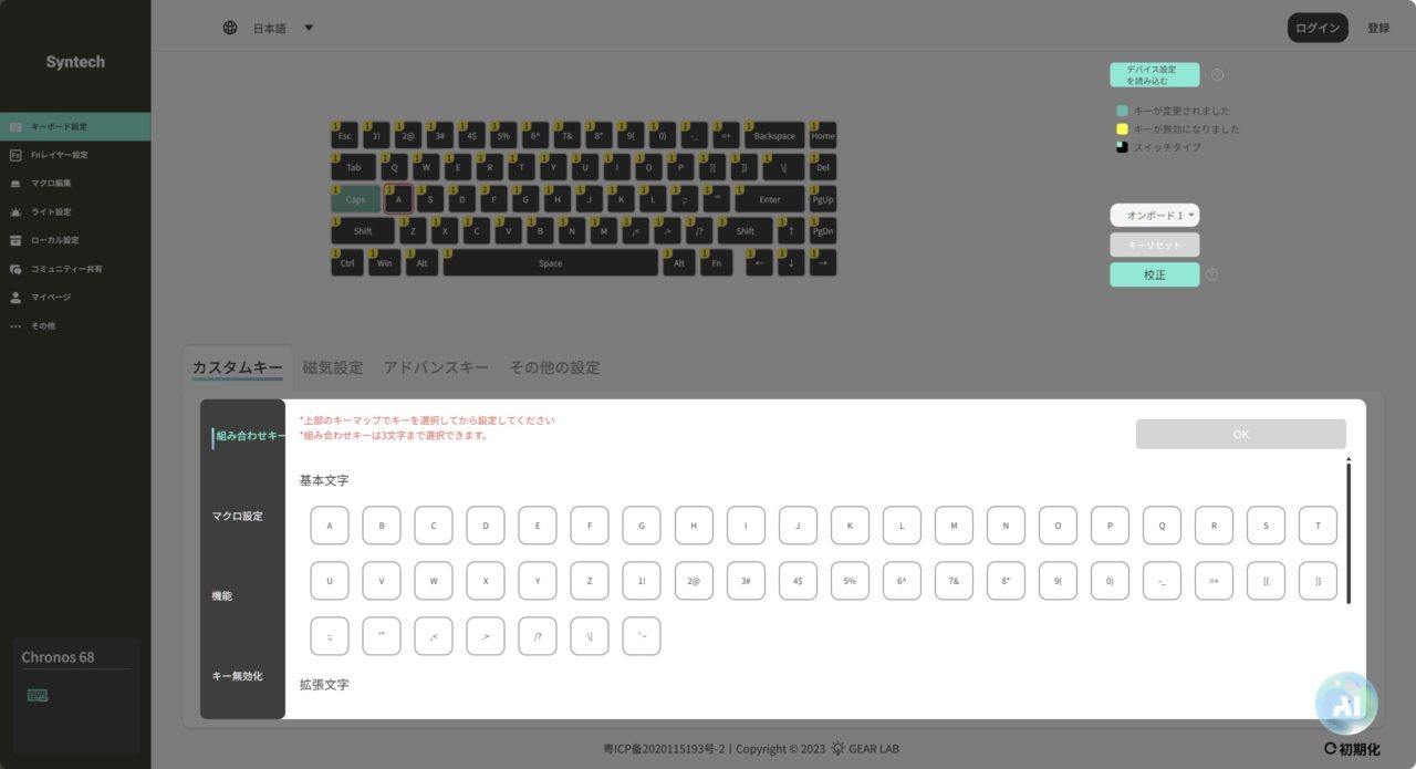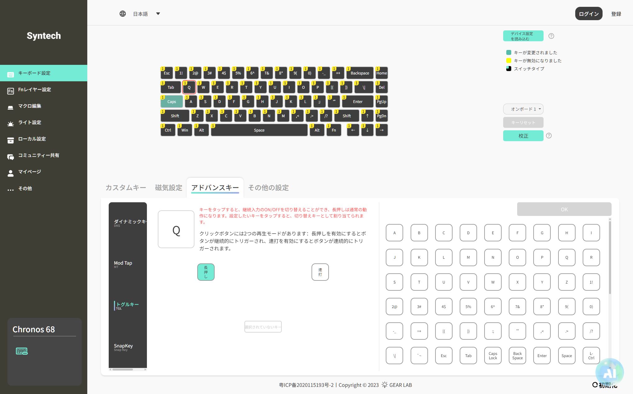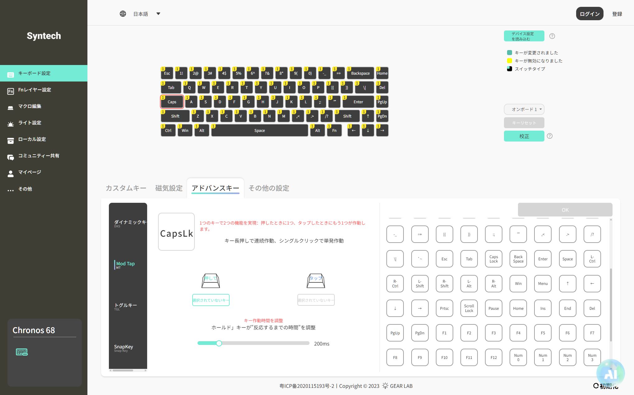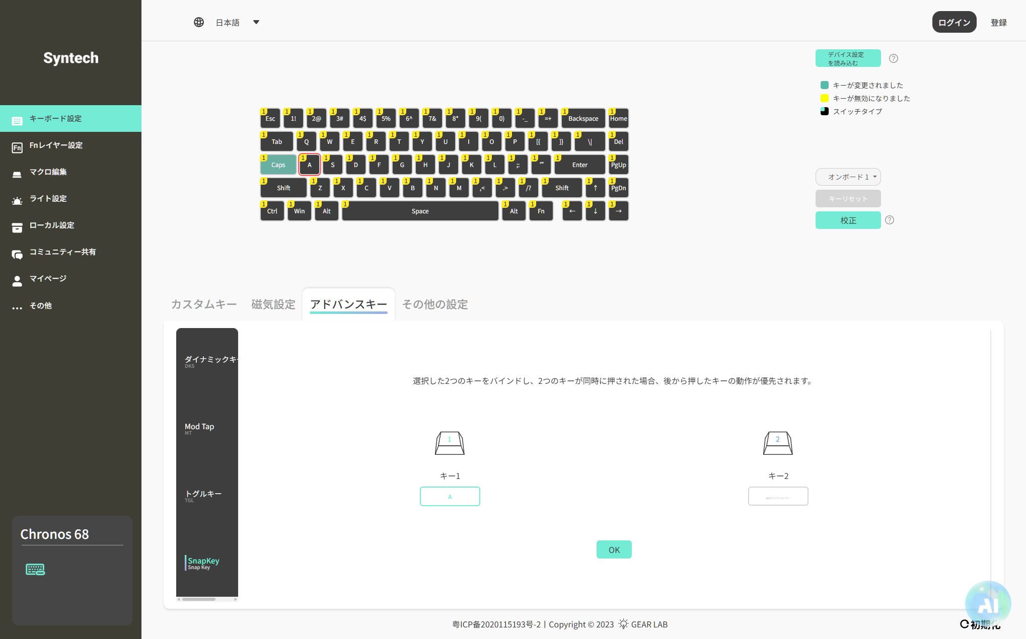 Chronos 68のドライバーには、通常のキーリマップとは別に、複数の入力動作や状態を扱える「アドバンスキー設定」が用意されています。