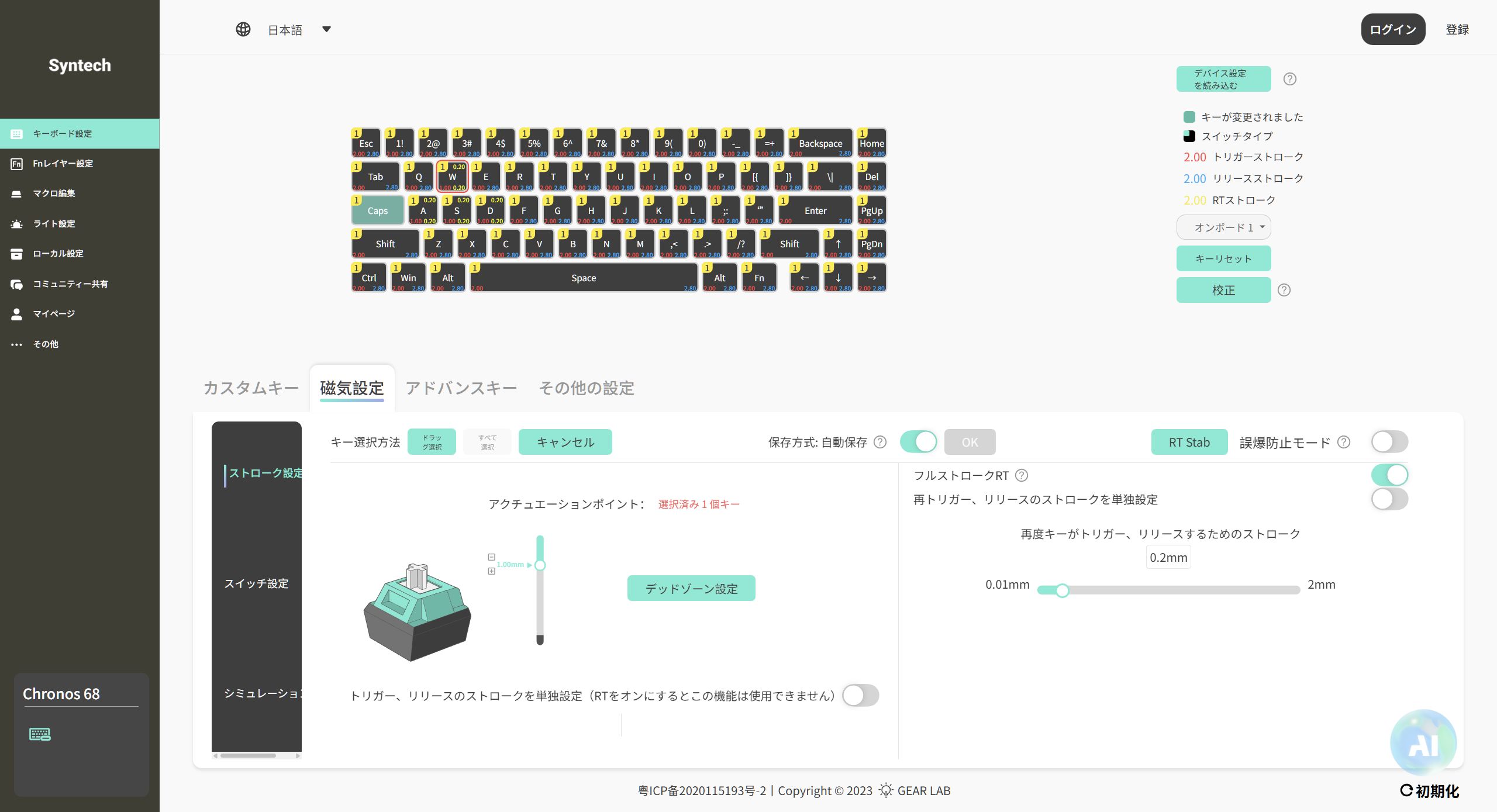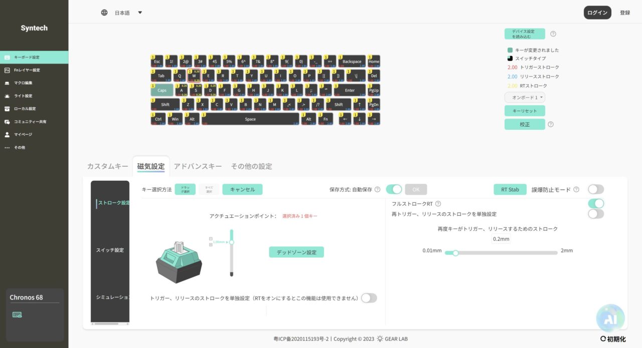 Syntech Chronos 68は、ラピッドトリガーやSnap Tap、アクチュエーション調整など、多くの機能をドライバーソフト上で設定できます。