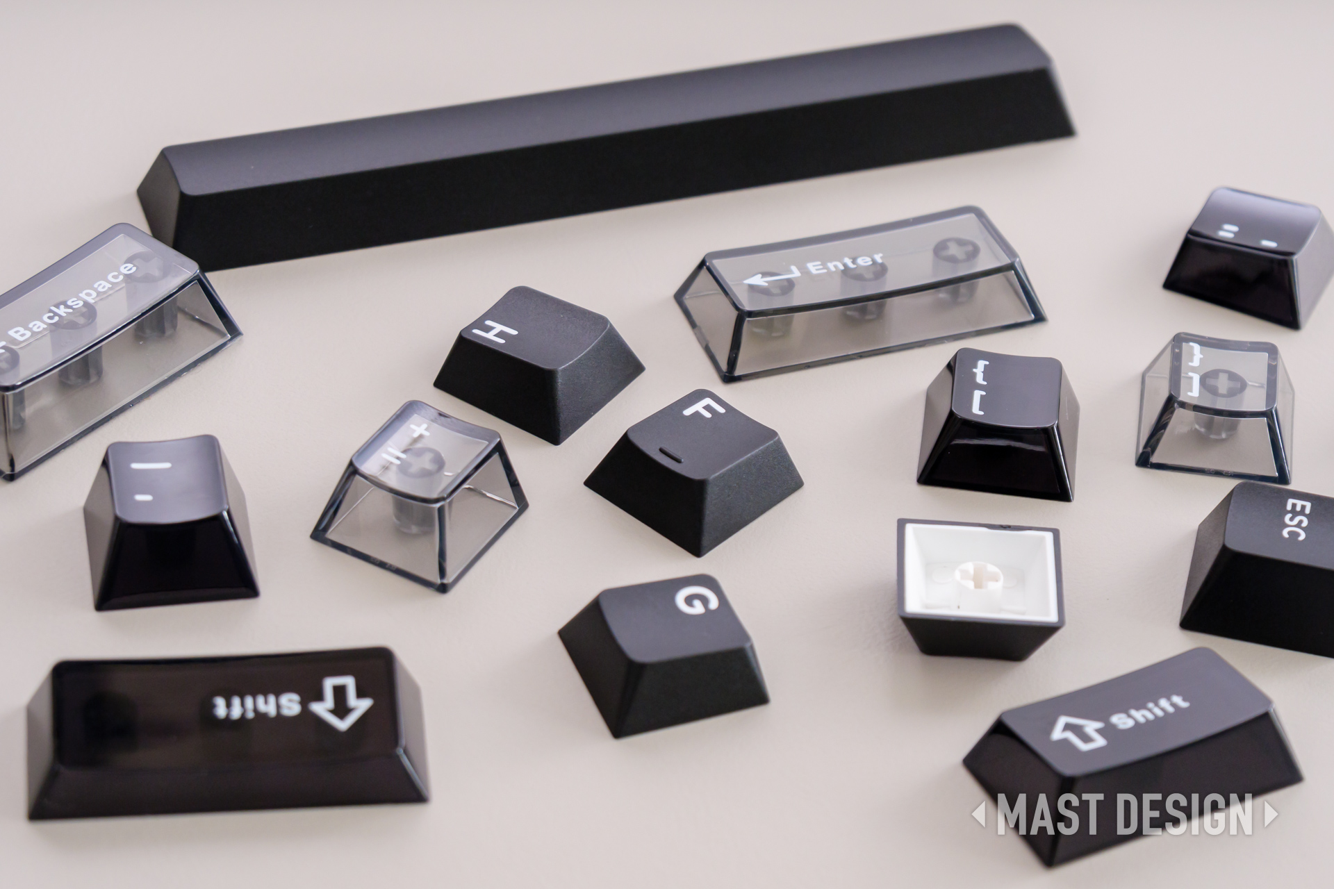 今回使用したブラックモデルは、合計3種類のキーキャップ構成になっています。(※他のカラーモデルはダブルショットPBTキーキャップ)