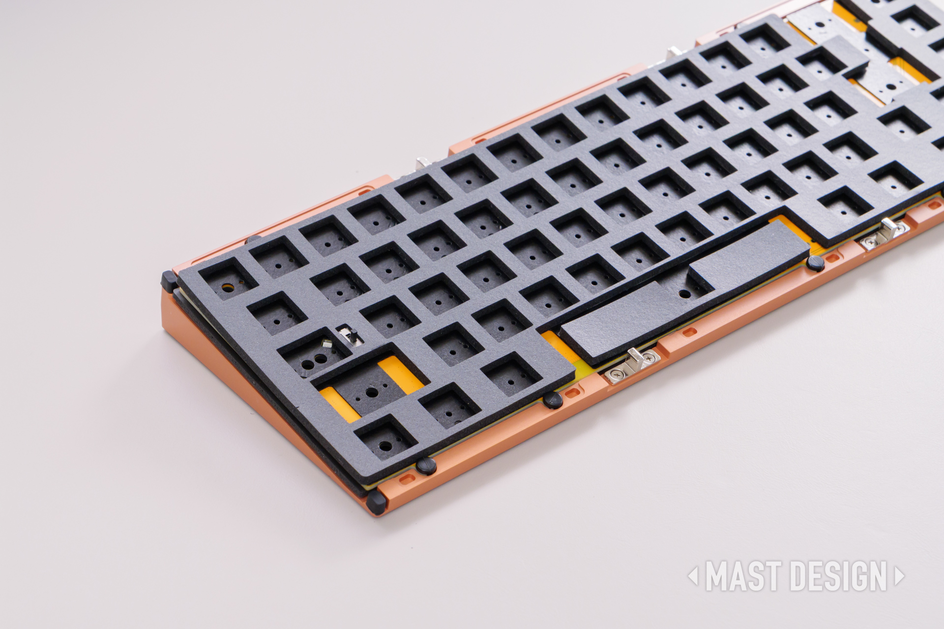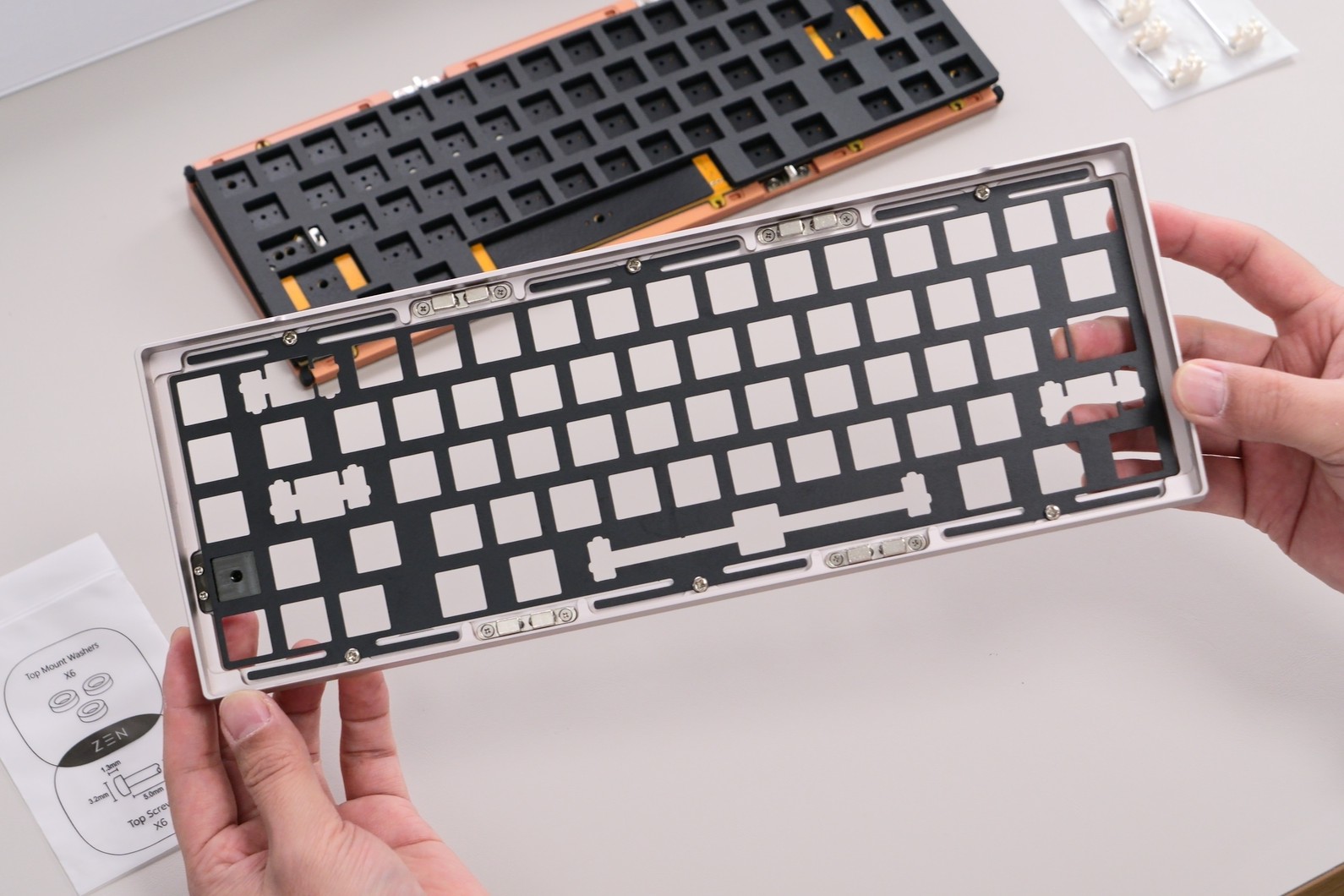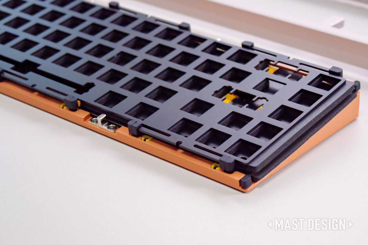 ZEN65 Copperには、打鍵音や打鍵感を調整するための複数のフォームが用意されていますが、今回は標準的な構成で組み立てています。
