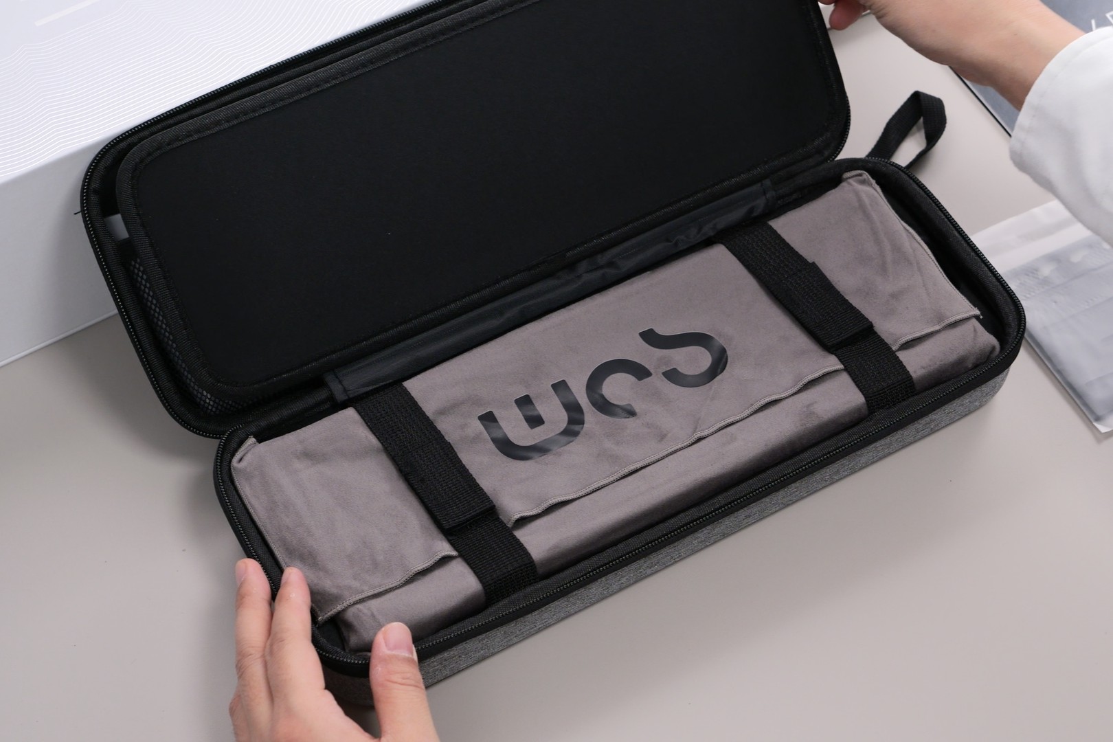 フィルムパッケージされたキーボード本体は、フランネル収納袋に包まれて収納バッグに入っています。
