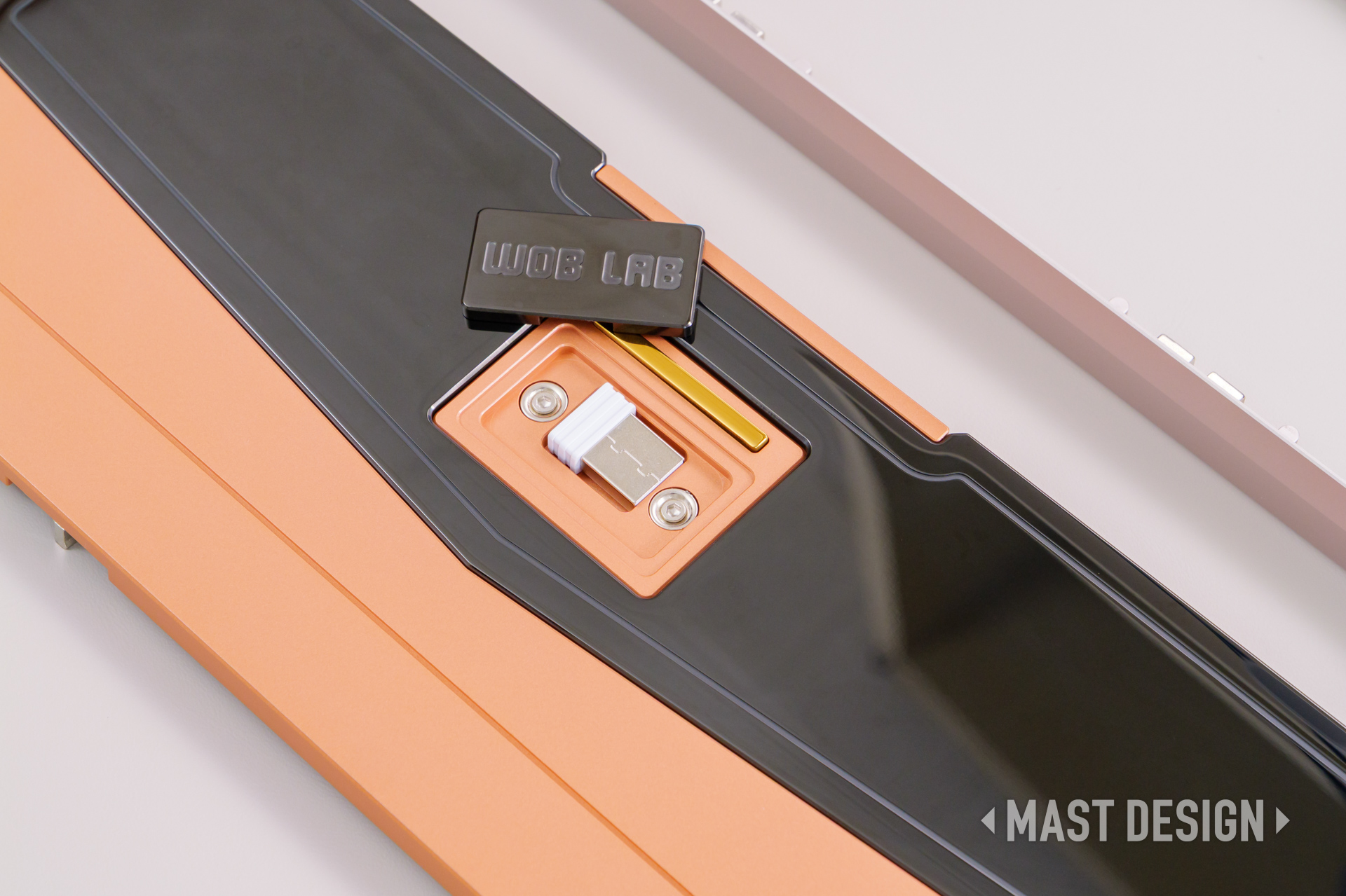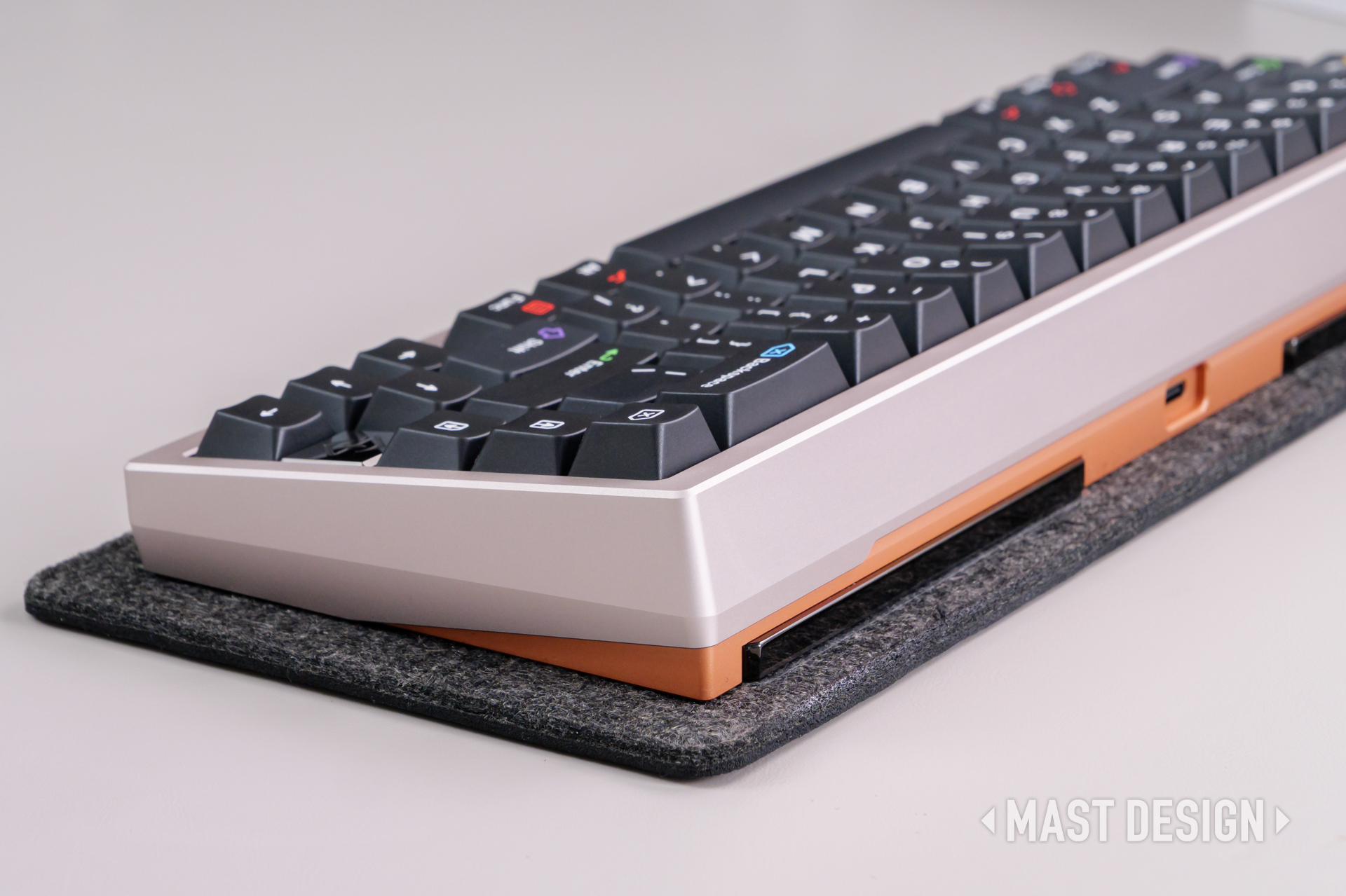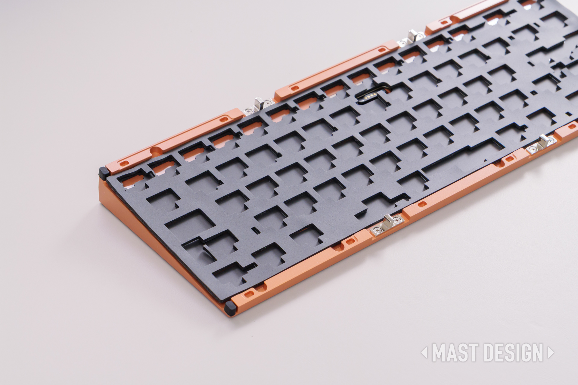 最大の特徴は、高密度の純銅(Copper)ボトムケースを採用している点。筐体重量は約2.5kgと、65%キーボードとしてはかなり重量感のあるボディとなっており、金属の塊のような存在感があります。