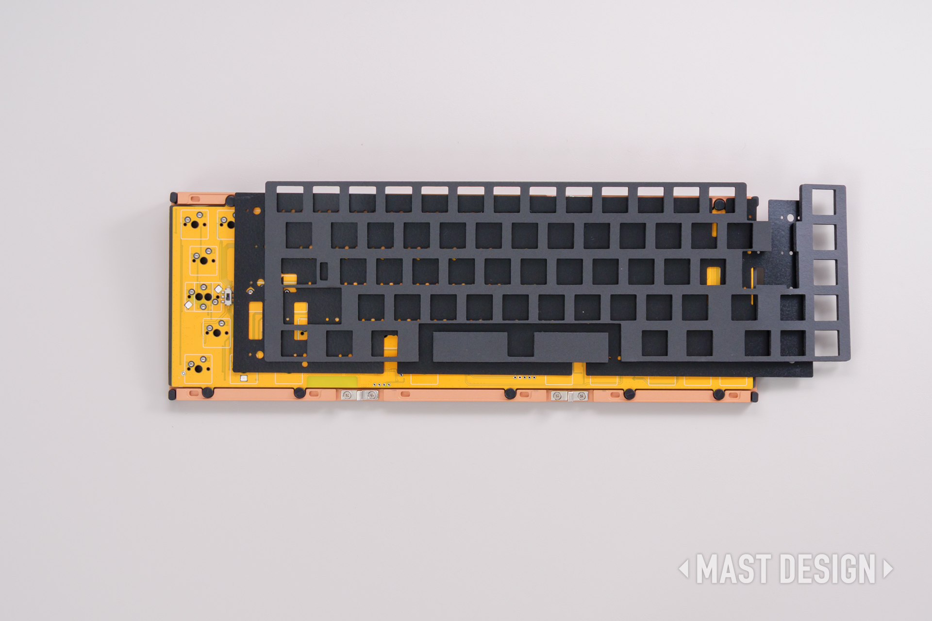 PCBとプレートの間には、下から順に IXPEフォーム と Poronスイッチフォーム が配置されています。