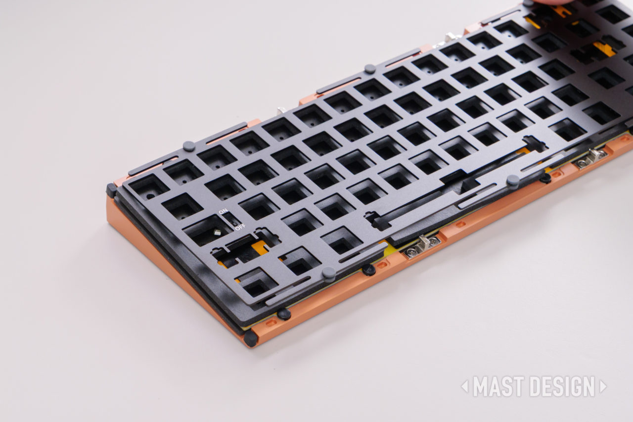 プレート周辺を包み込むように装着するタイプで、比較的柔らかい打鍵感になる構成です。