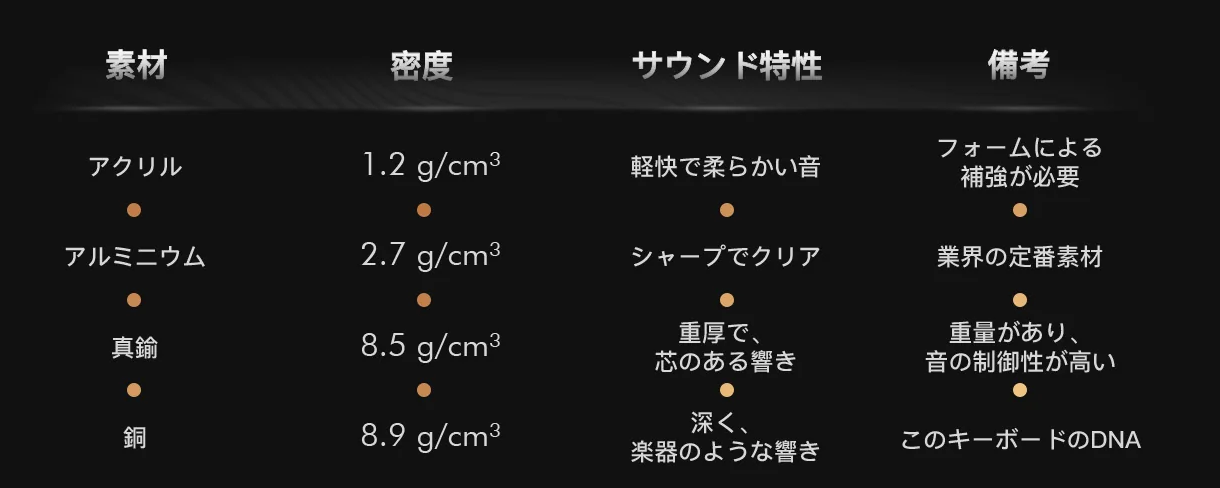 アルミケースのキーボードがシャープでクリアな音になる傾向があるのに対し、銅ケースはより重厚で芯のある響きになるのが特徴です。