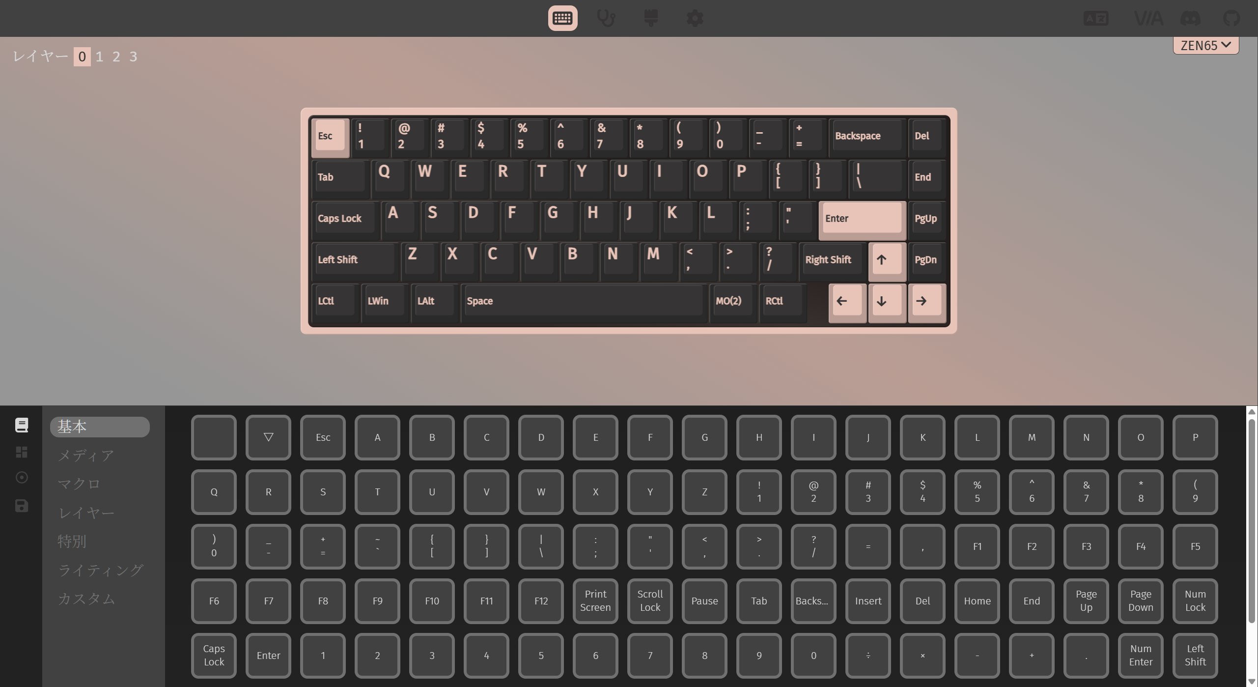 ZEN65通常モデルと同じくVIA対応しているため、キーリマップ/マクロをWebアプリで設定することができます。