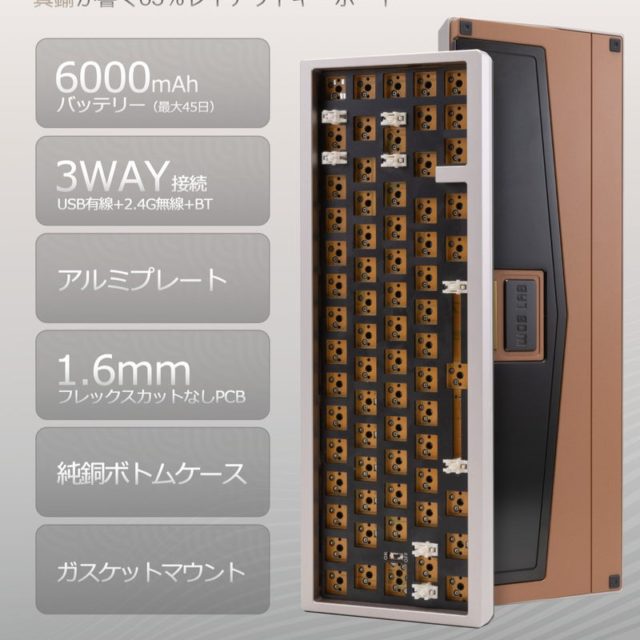 65%キーボードキットとしては、かなり高級な価格帯ではありますが、純銅ボトムケースによる重量感や存在感、そして密度のある打鍵感とスイッチの個性を活かしたサウンド。